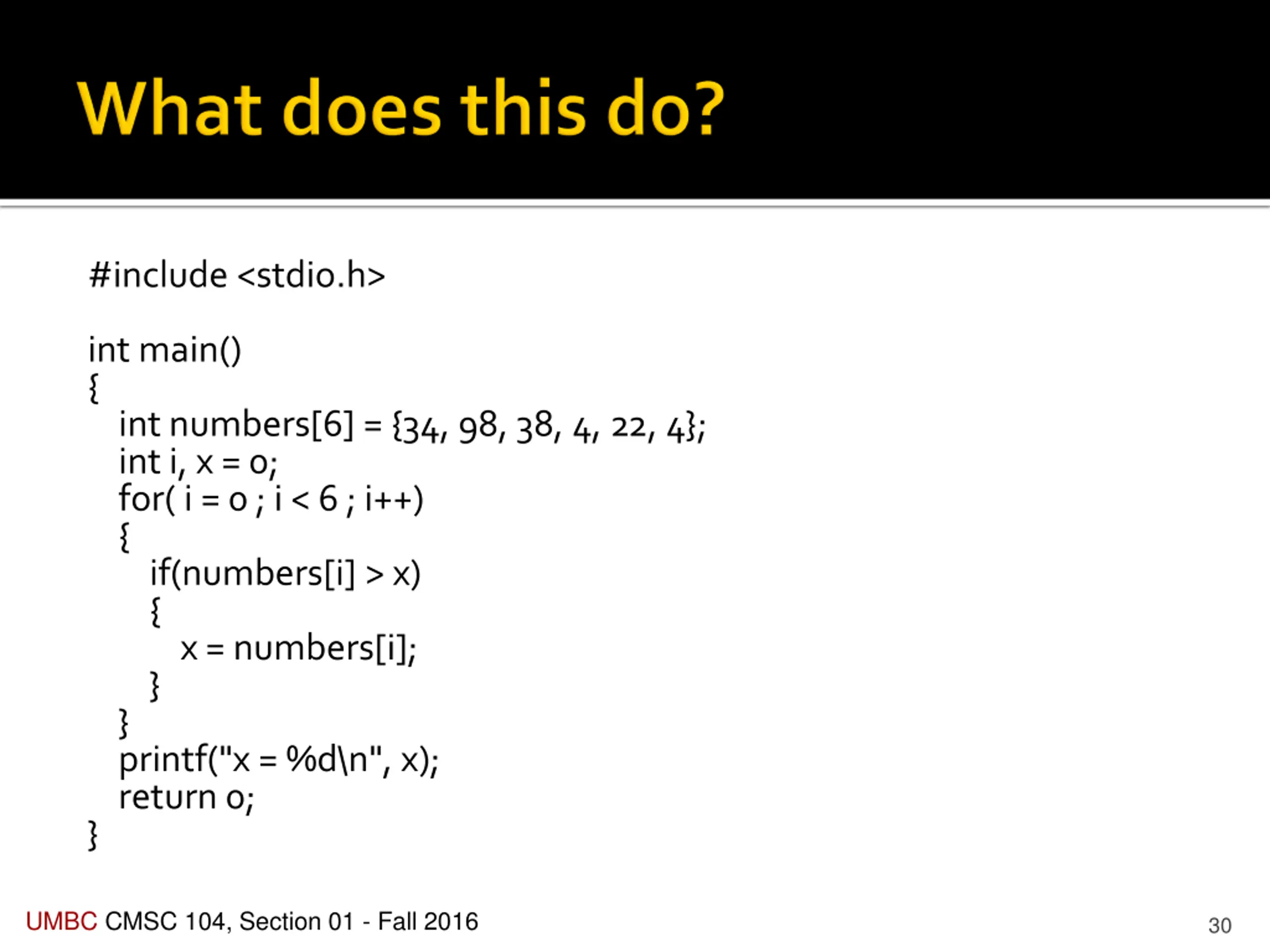 #include <stdio.h> int main() { int numbers[6] = {34, 98, 38, 4, 22, 4}; int i, x = 0; for( i = 0 ; i < 6 ; i++) { if(numbers[i] > x) { x = numbers[i]; } } printf("x = %d\n", x); return 0; } UMBC CMSC 104, Section 01 - Fall 2016 30