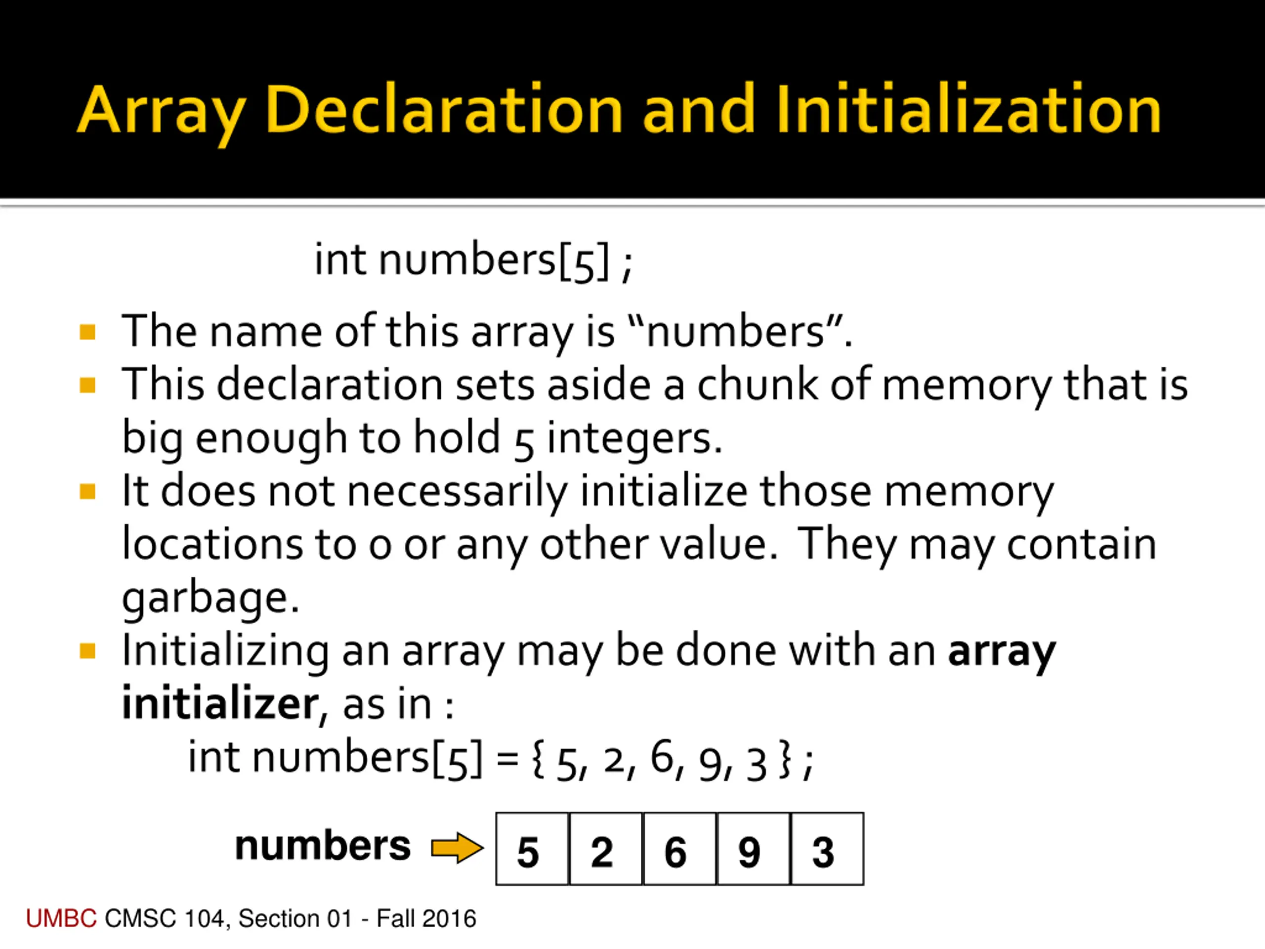 int numbers[5] ; The name of this array is numbers . This declaration sets aside a chunk of memory that is big enough to hold 5 integers. It does not necessarilyinitialize those memory locations to 0 or any other value. They may contain garbage. Initializing an array may be done with an array initializer, as in : int numbers[5] = { 5, 2, 6, 9, 3 } ; numbers 5 2 6 9 3 UMBC CMSC 104, Section 01 - Fall 2016