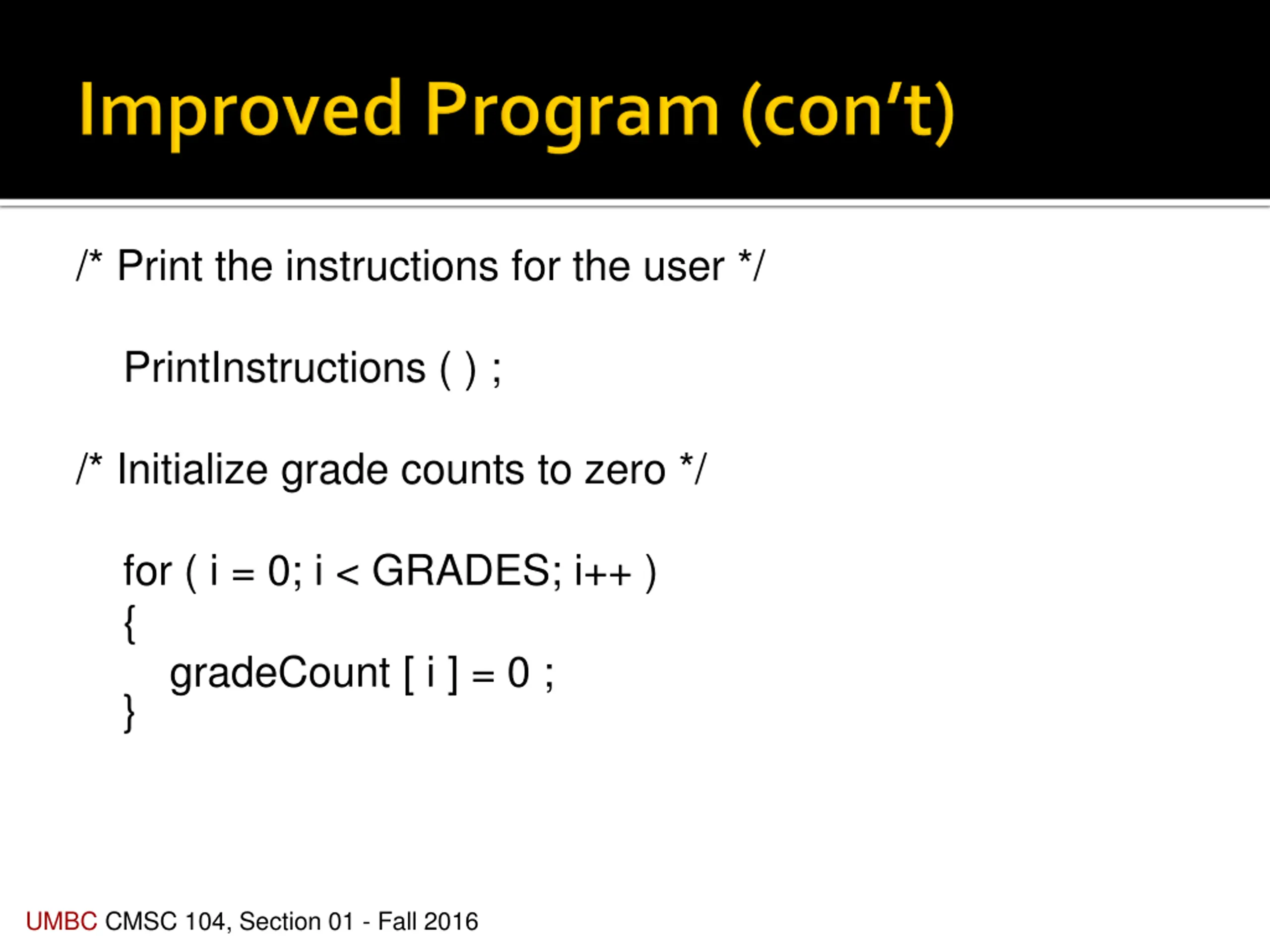 /* Print the instructions for the user */ PrintInstructions ( ) ; /* Initialize grade counts to zero */ for ( i = 0; i < GRADES; i++ ) { gradeCount [ i ] = 0 ; } UMBC CMSC 104, Section 01 - Fall 2016