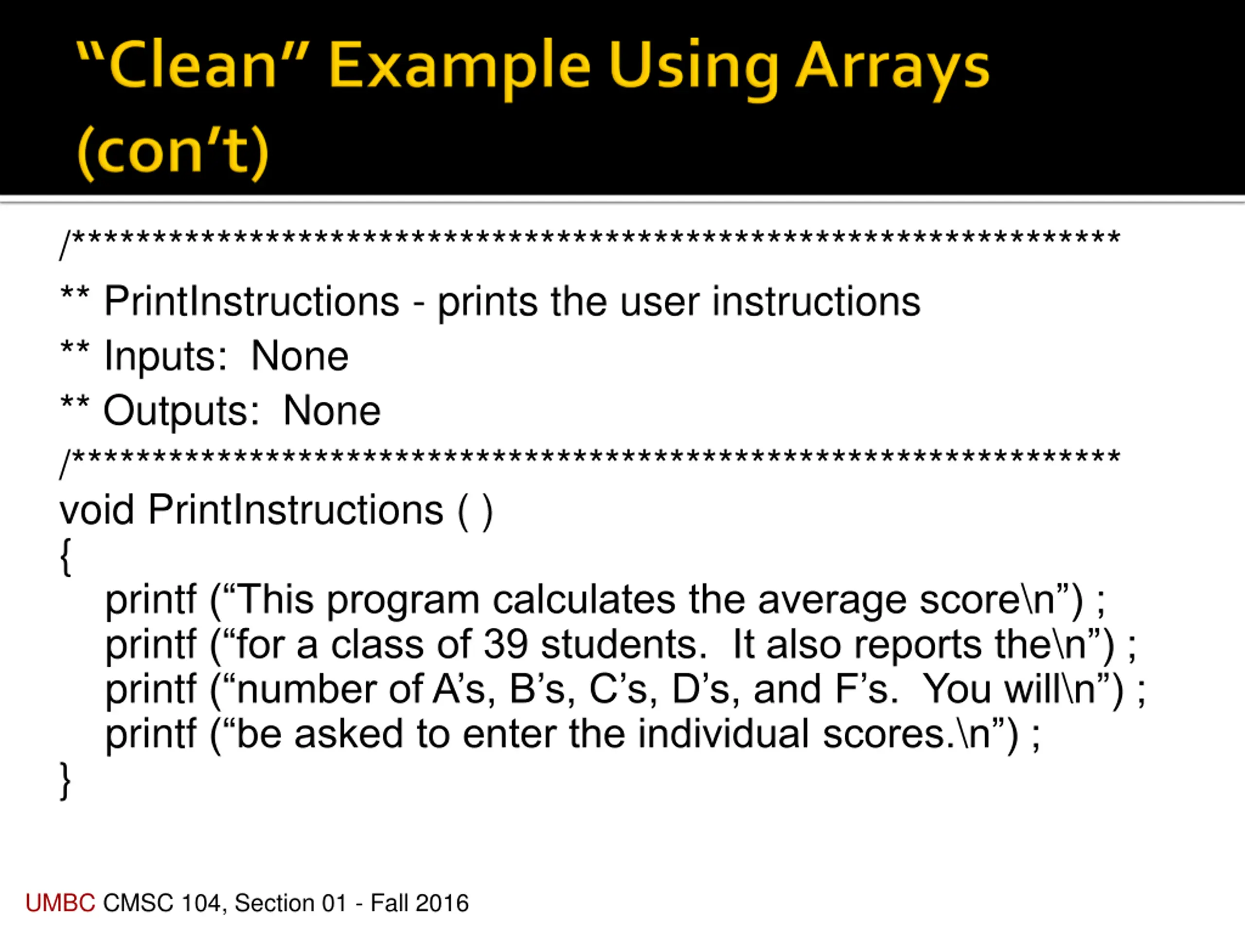 /*****************************************************************/***************************************************************** ** PrintInstructions - prints the user instructions ** Inputs: None ** Outputs: None /***************************************************************** void PrintInstructions ( ) { printf ( This program calculates the average score\n ) ; printf ( for a class of 39 students. It also reports the\n ) ; printf ( number of A s, B s, C s, D s, and F s. You will\n ) ; printf ( be asked to enter the individual scores.\n ) ; } UMBC CMSC 104, Section 01 - Fall 2016