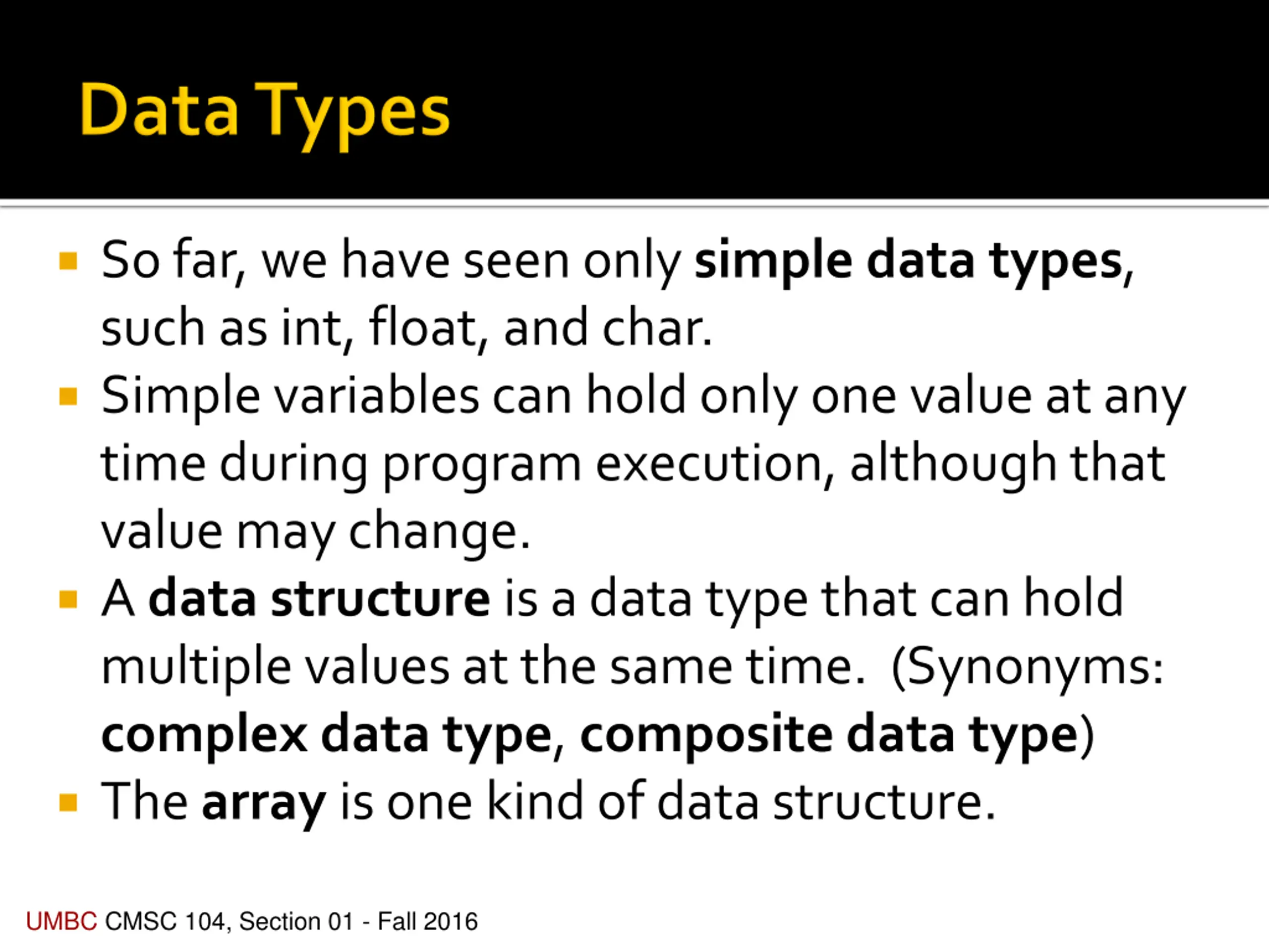 So far, we have seen only simple data types, such as int, float, and char. Simple variables can hold only one value at any time during program execution, although that value may change. A data structure is a data type that can hold multiple values at the same time. (Synonyms: complex data type, composite data type) The array is one kind of data structure. UMBC CMSC 104, Section 01 - Fall 2016