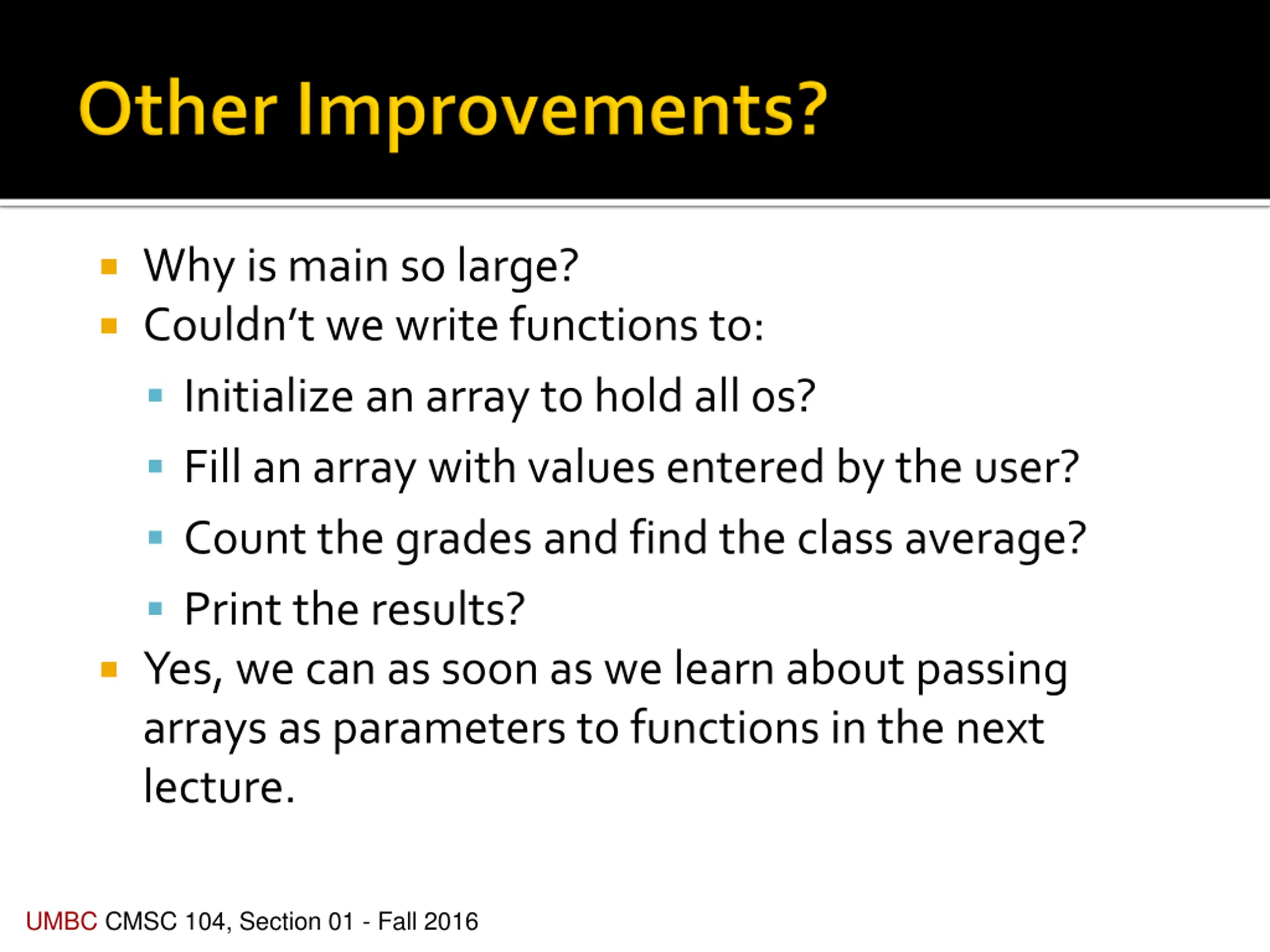 Why is main so large? Couldn t we write functions to: Initialize an array to hold all 0s? Fill an array with values entered by the user? Count the grades and find the class average? Print the results? Yes, we can as soon as we learn about passing arrays as parameters to functions in the next lecture. UMBC CMSC 104, Section 01 - Fall 2016