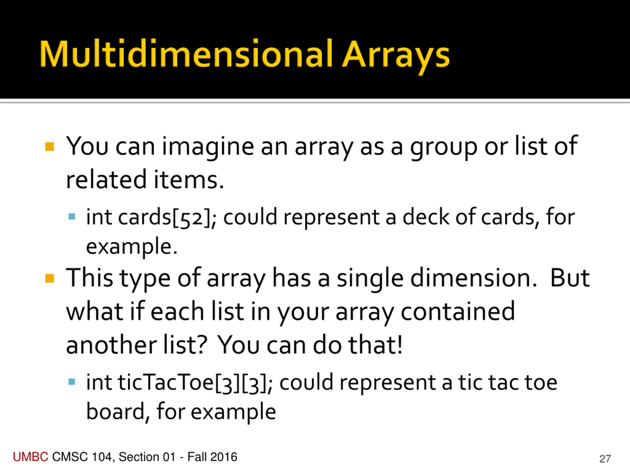 You can imagine an array as a group or list of related items. int cards[52]; could represent a deck of cards, for example. This type of array has a single dimension. But what if each list in your array contained another list? You can do that! int ticTacToe[3][3]; could represent a tic tac toe board, for example UMBC CMSC 104, Section 01 - Fall 2016 27
