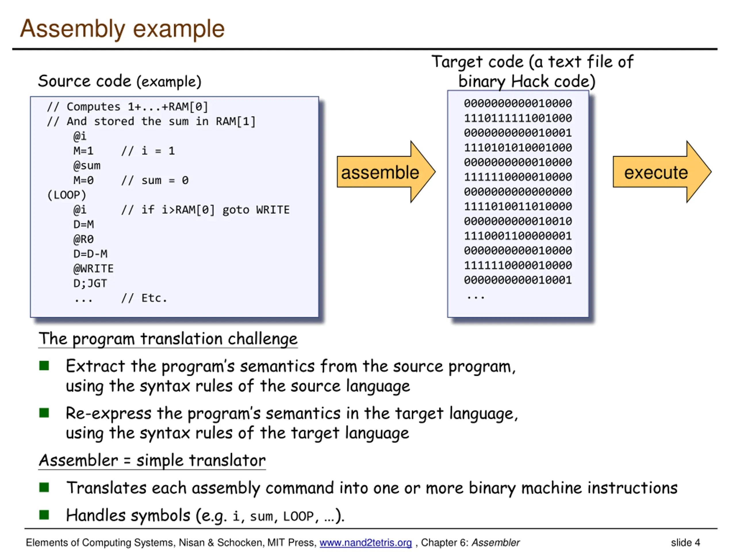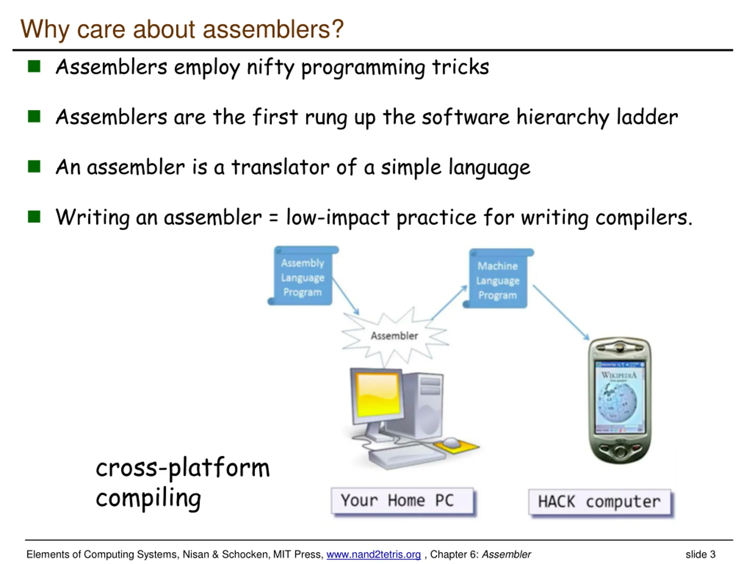 Why care about assemblers? Assemblers employ nifty programming tricks Assemblers are the first rung up the software hierarchy ladder An assembler is a translator of a simple language Writing an assembler = low-impact practice for writing compilers. cross-platform compiling www.nand2tetris.org Elements of Computing Systems, Nisan & Schocken, MIT Press, www.nand2tetris.org , Chapter 6: Assembler slide 3