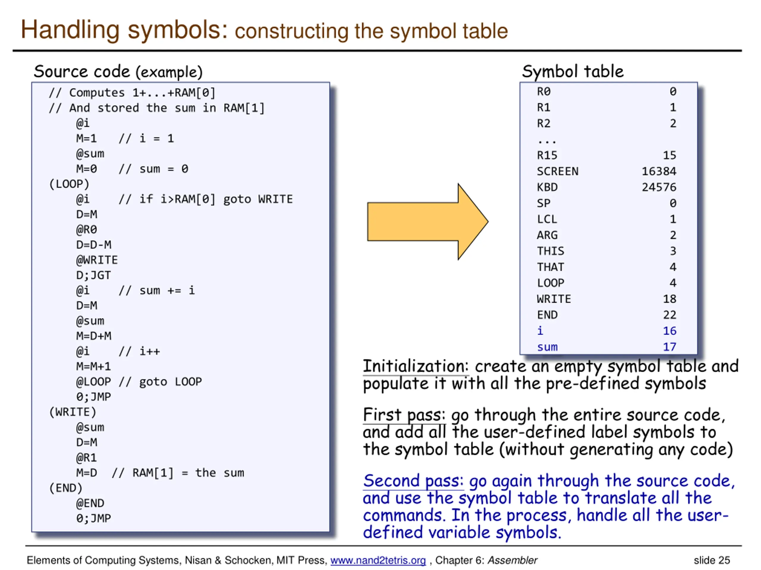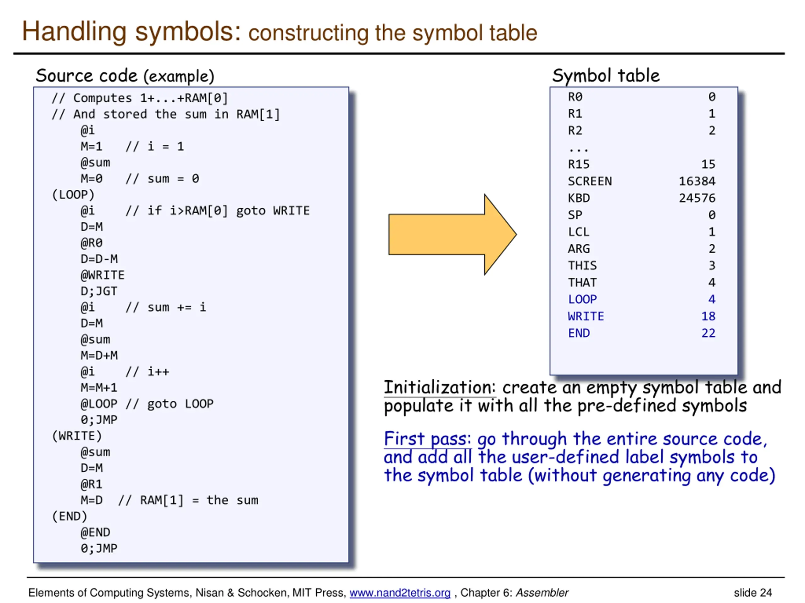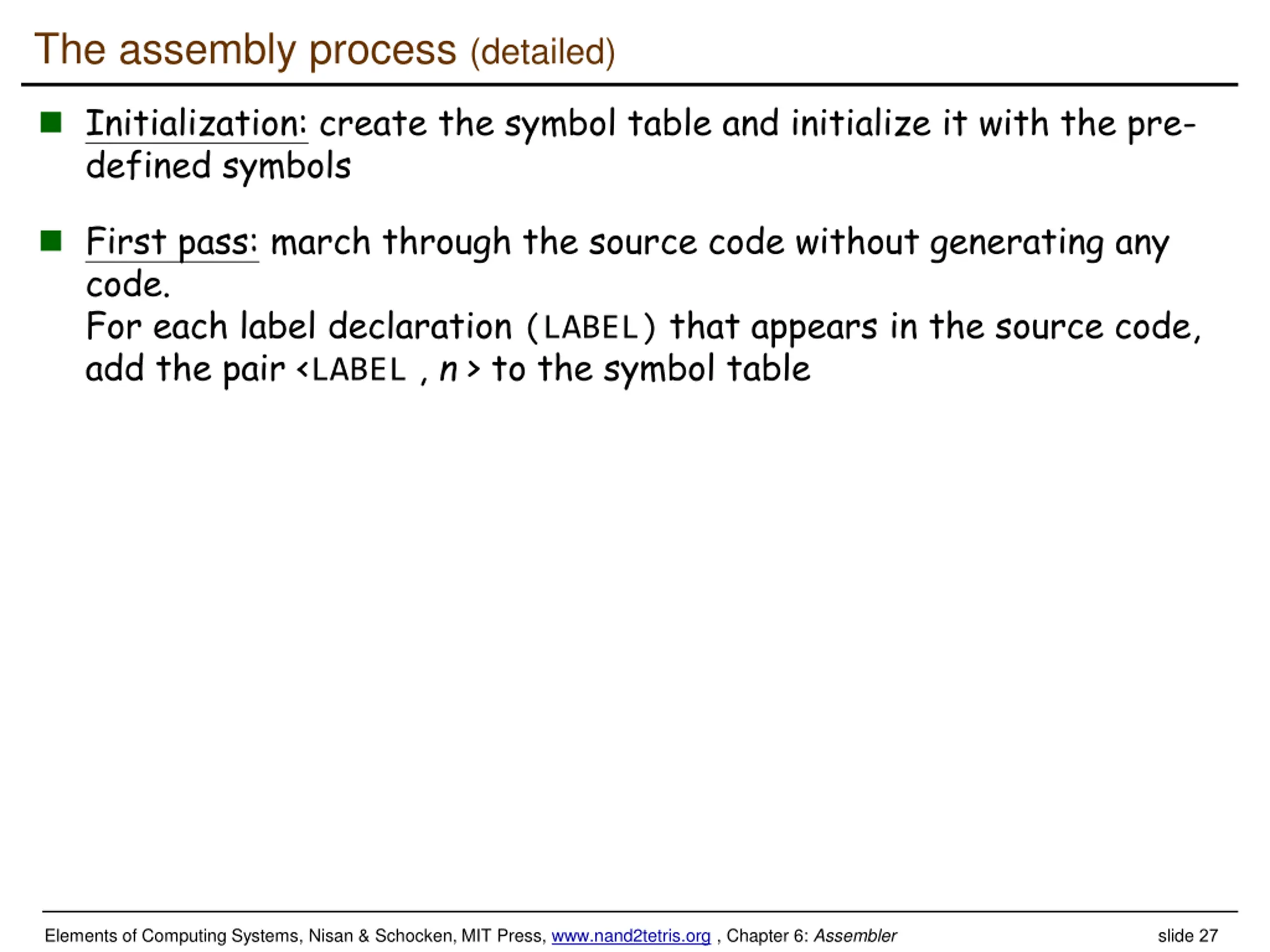 The assembly process (detailed) Initialization: create the symbol table and initialize it with the pre- defined symbols First pass: march through the source code without generating any code. For each label declaration (LABEL) that appears in the source code, add the pair <LABEL , n > to the symbol table www.nand2tetris.org Elements of Computing Systems, Nisan & Schocken, MIT Press, www.nand2tetris.org , Chapter 6: Assembler slide 27