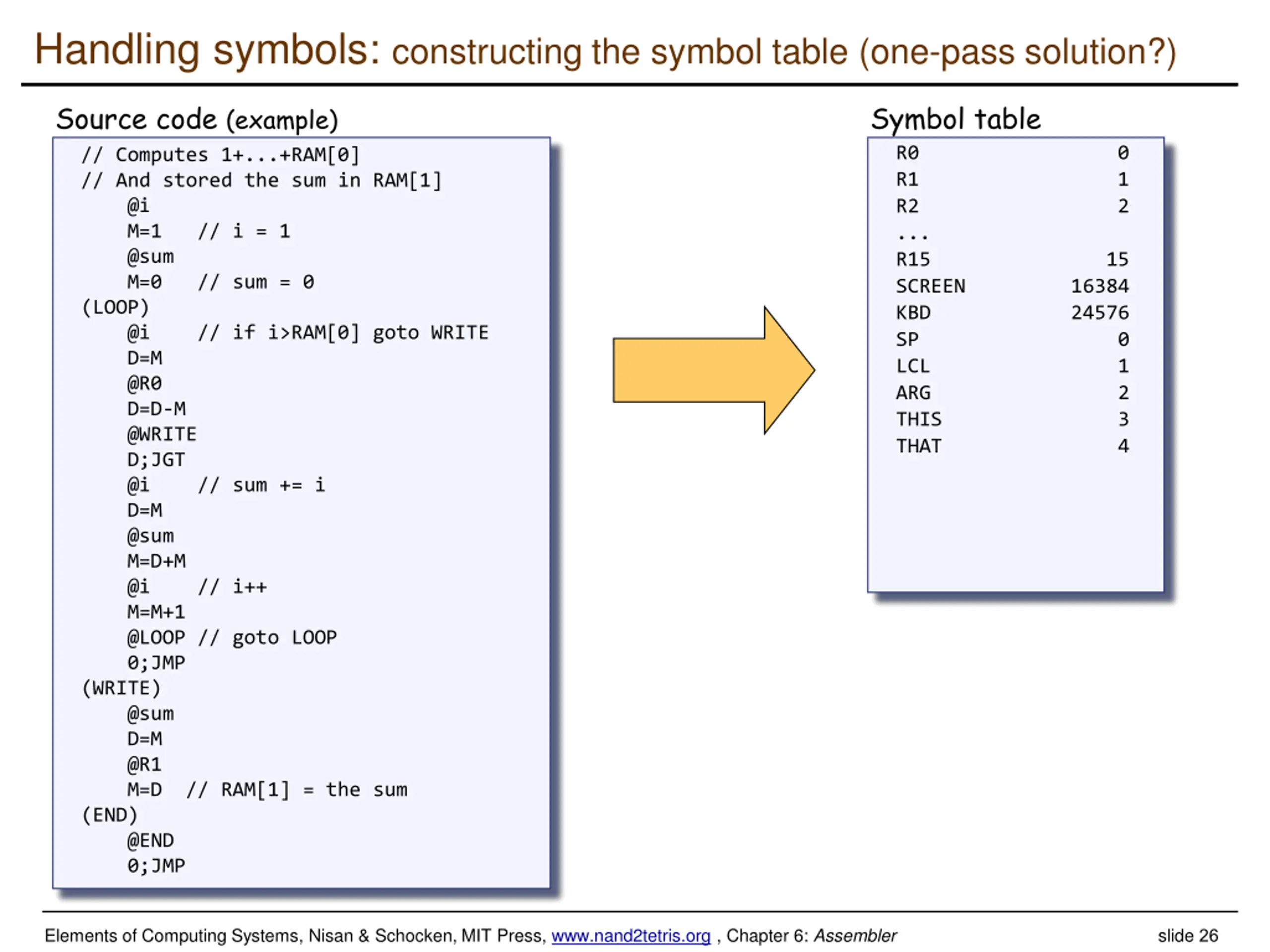 Handling symbols: constructing the symbol table (one-pass solution?) Source code (example) Symbol table R0 0 R1 1 R2 2 ... R15 15 SCREEN 16384 KBD 24576 SP 0 LCL 1 ARG 2 THIS 3 THAT 4 // Computes 1+...+RAM[0] // And stored the sum in RAM[1] @i M=1 // i = 1 @sum M=0 // sum = 0 (LOOP) @i // if i>RAM[0] goto WRITE D=M @R0 D=D-M @WRITE D;JGT @i // sum += i D=M @sum M=D+M @i // i++ M=M+1 @LOOP // goto LOOP 0;JMP (WRITE) @sum D=M @R1 M=D // RAM[1] = the sum (END) @END 0;JMP www.nand2tetris.org Elements of Computing Systems, Nisan & Schocken, MIT Press, www.nand2tetris.org , Chapter 6: Assembler slide 26