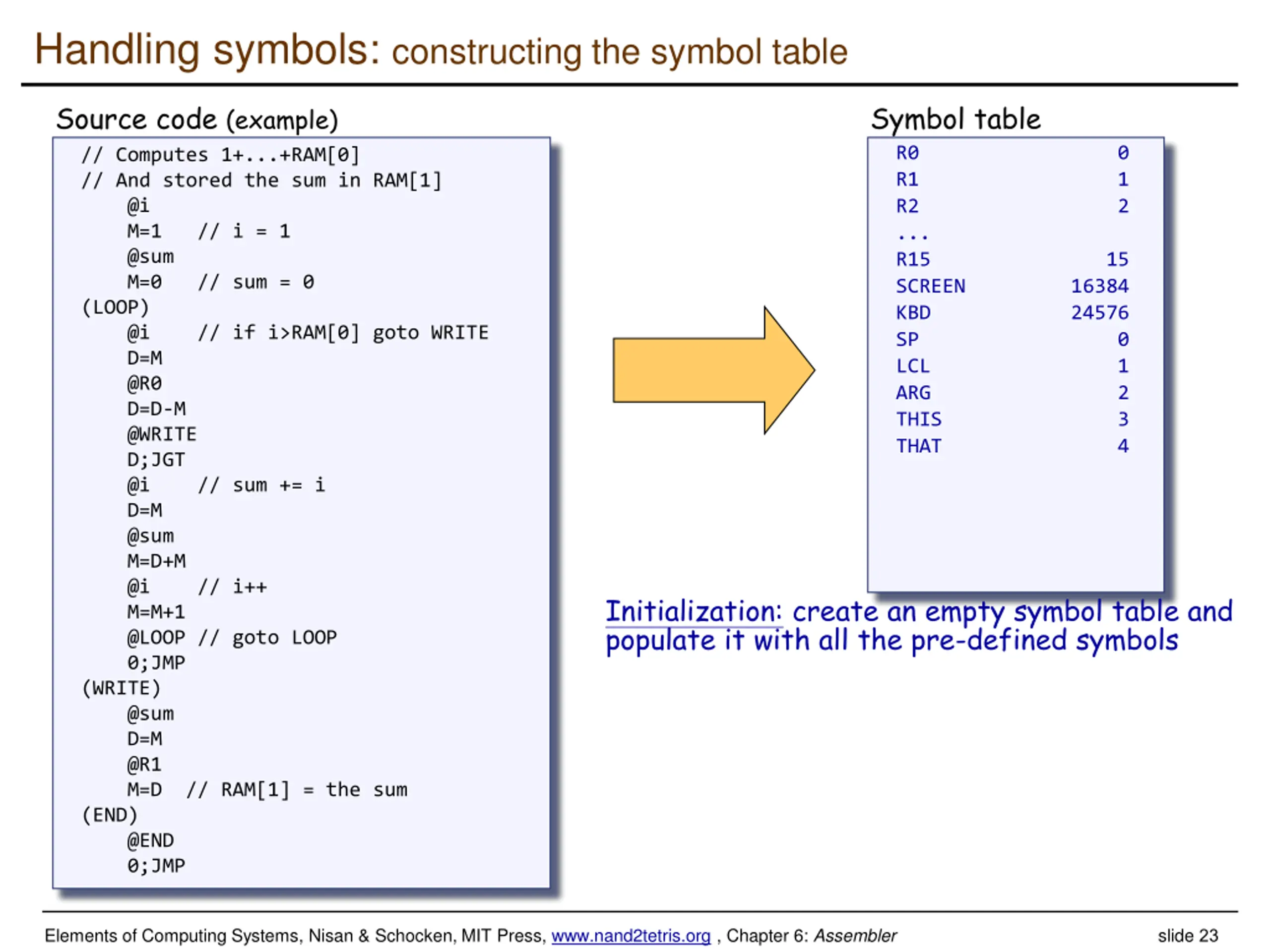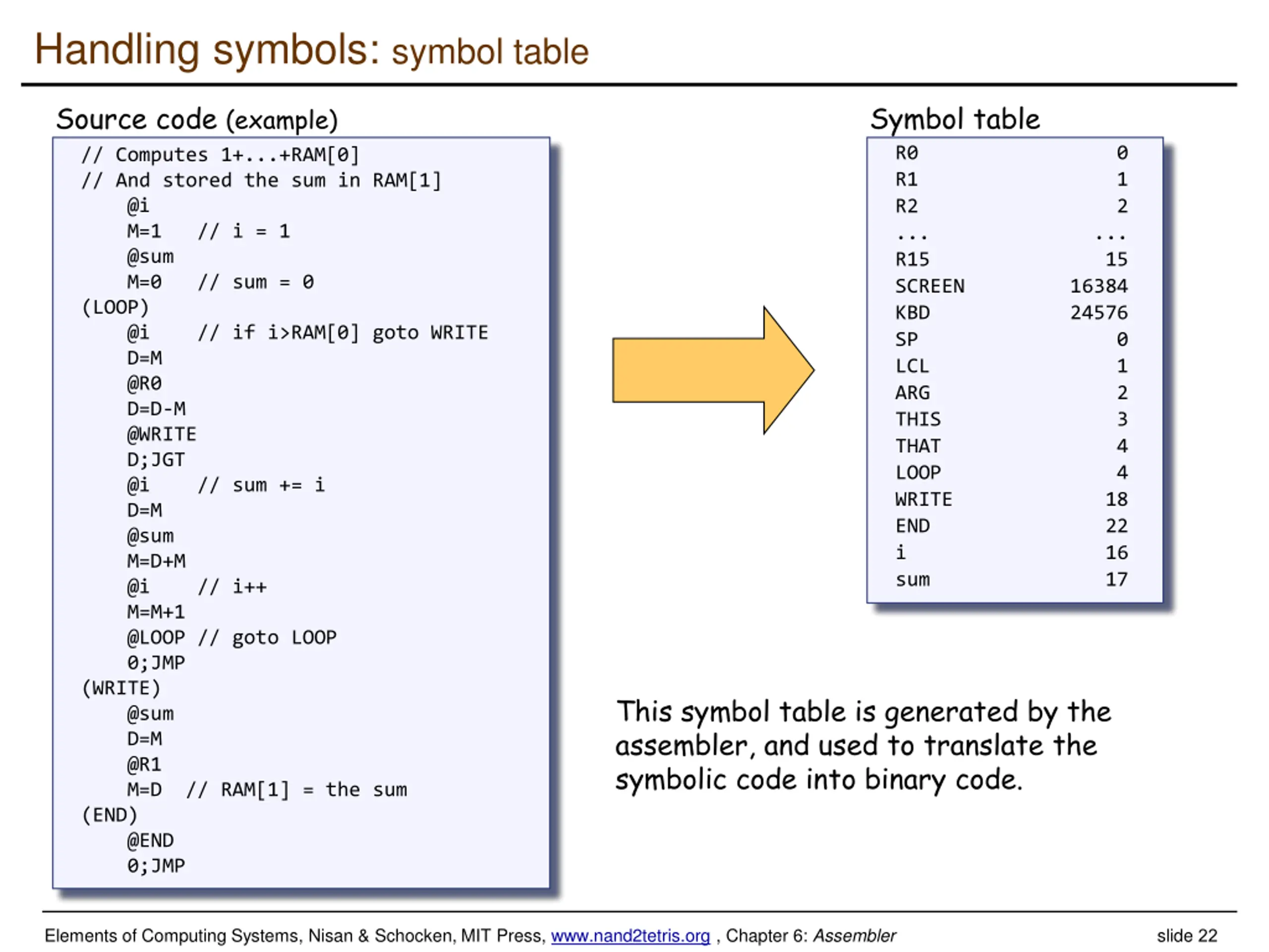 Handling symbols: symbol table Source code (example) Symbol table R0 0 R1 1 R2 2 ... ... R15 15 SCREEN 16384 KBD 24576 SP 0 LCL 1 ARG 2 THIS 3 THAT 4 LOOP 4 WRITE 18 END 22 i sum 17 // Computes 1+...+RAM[0] // And stored the sum in RAM[1] @i M=1 // i = 1 @sum M=0 // sum = 0 (LOOP) @i // if i>RAM[0] goto WRITE D=M @R0 D=D-M @WRITE D;JGT @i // sum += i D=M @sum M=D+M @i // i++ M=M+1 @LOOP // goto LOOP 0;JMP (WRITE) @sum D=M @R1 M=D // RAM[1] = the sum (END) @END 0;JMP 16 This symbol table is generated by the assembler, and used to translate the symbolic code into binary code. www.nand2tetris.org Elements of Computing Systems, Nisan & Schocken, MIT Press, www.nand2tetris.org , Chapter 6: Assembler slide 22
