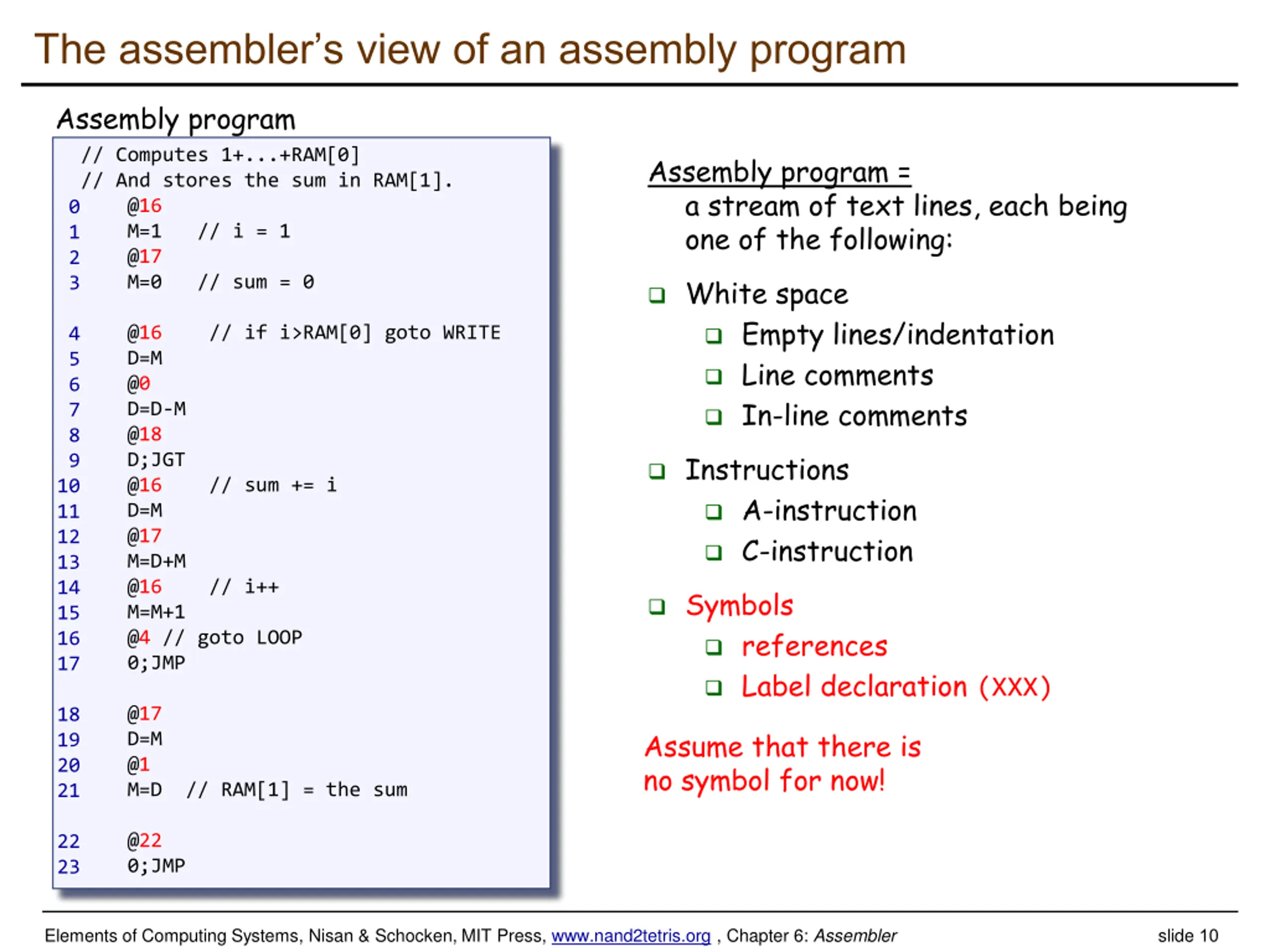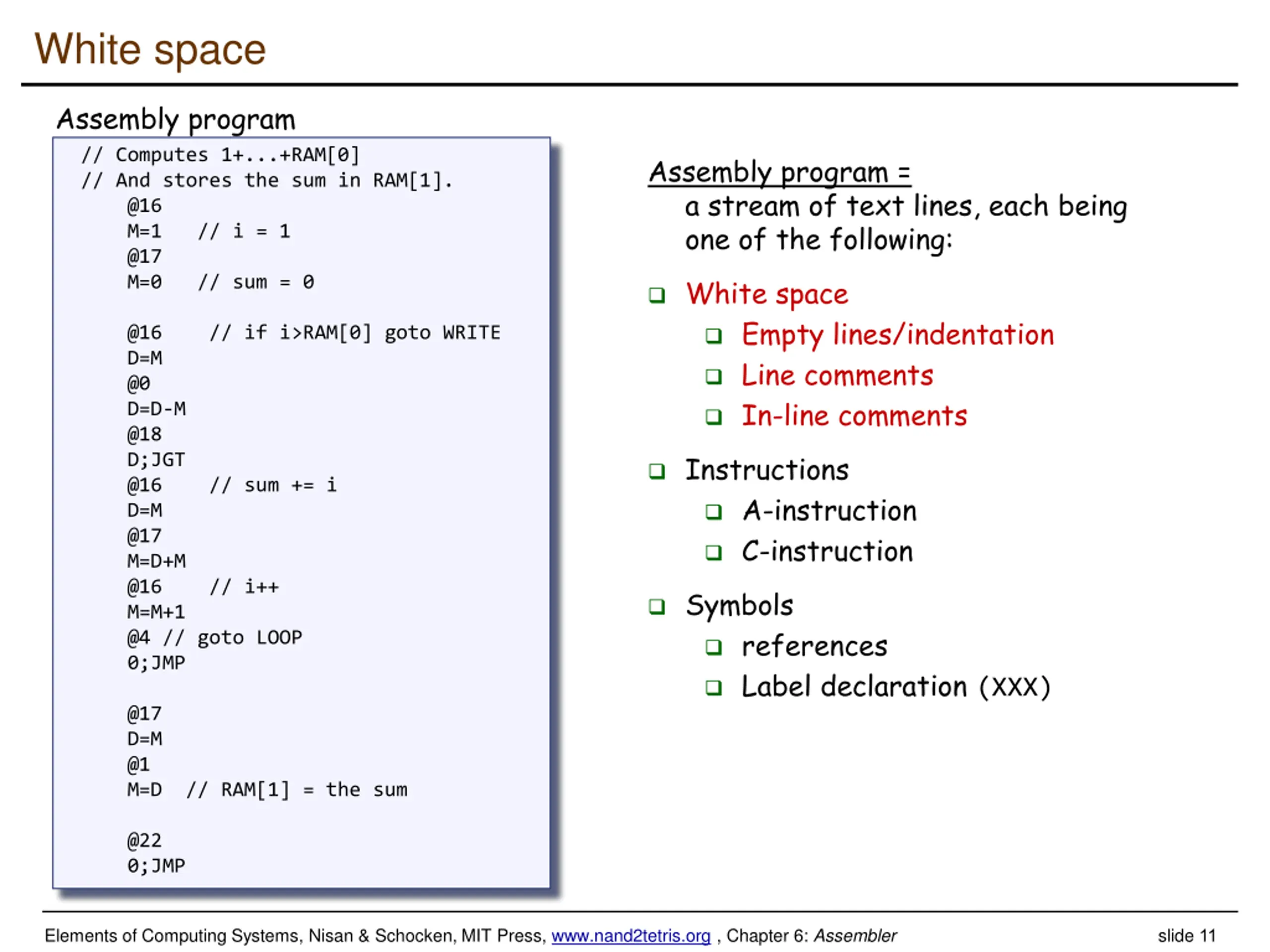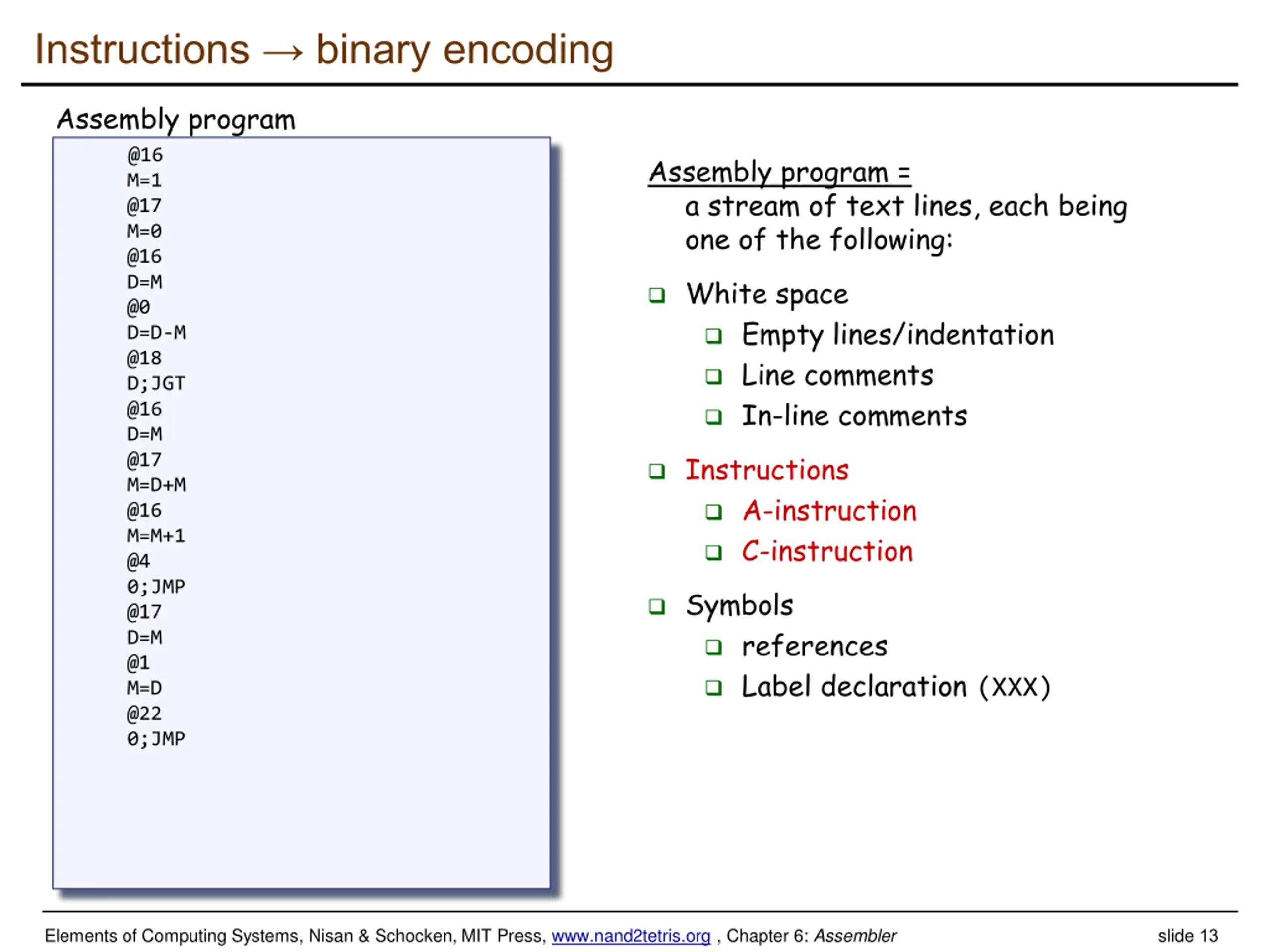 White space ignore/remove them Assembly program @16 M=1 @17 M=0 @16 D=M @0 D=D-M @18 D;JGT @16 D=M @17 M=D+M @16 M=M+1 @4 0;JMP @17 D=M @1 M=D @22 0;JMP Assembly program = a stream of text lines, each being one of the following: White space Empty lines/indentation Line comments In-line comments Instructions A-instruction C-instruction Symbols references Label declaration (XXX) www.nand2tetris.org Elements of Computing Systems, Nisan & Schocken, MIT Press, www.nand2tetris.org , Chapter 6: Assembler slide 12