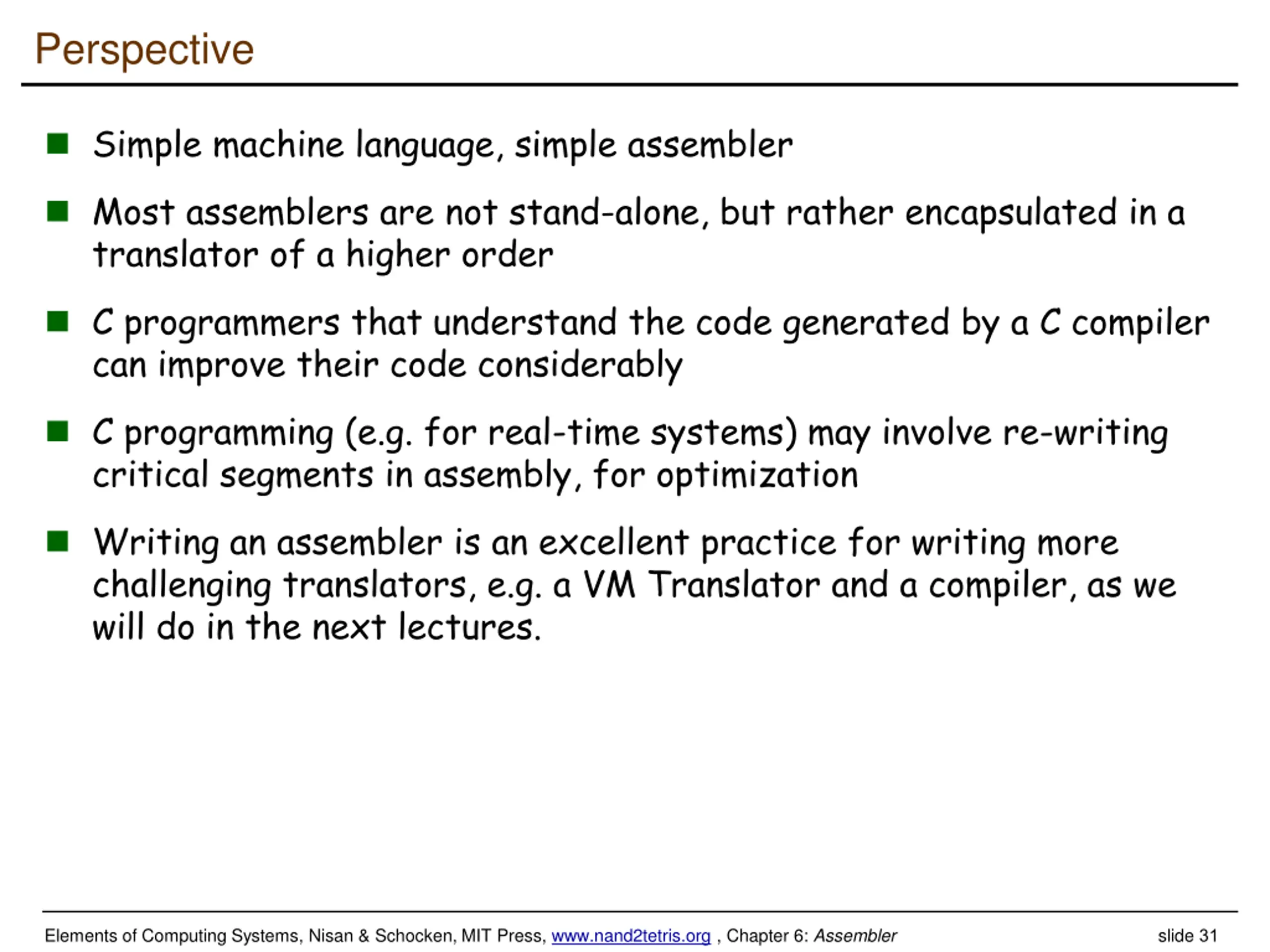 Perspective Simple machine language, simple assembler Most assemblers are not stand-alone, but rather encapsulated in a translator of a higher order C programmers that understand the code generated by a C compiler can improve their code considerably C programming (e.g. for real-time systems) may involve re-writing critical segments in assembly, for optimization Writing an assembler is an excellent practice for writing more challenging translators, e.g. a VM Translator and a compiler, as we will do in the next lectures. www.nand2tetris.org Elements of Computing Systems, Nisan & Schocken, MIT Press, www.nand2tetris.org , Chapter 6: Assembler slide 31