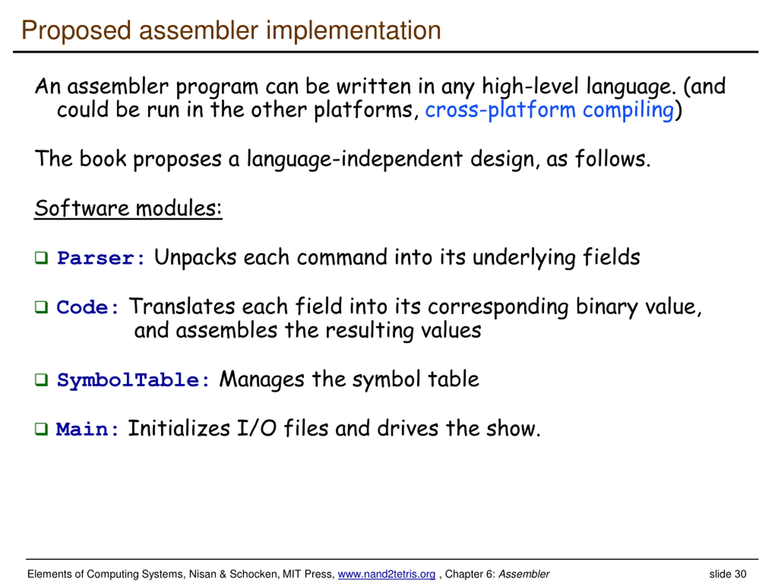 Proposed assembler implementation An assembler program can be written in any high-level language. (and could be run in the other platforms, cross-platform compiling) The book proposes a language-independent design, as follows. Software modules: Parser: Unpacks each command into its underlying fields Code: Translates each field into its corresponding binary value, and assembles the resulting values SymbolTable: Manages the symbol table Main: Initializes I/O files and drives the show. www.nand2tetris.org Elements of Computing Systems, Nisan & Schocken, MIT Press, www.nand2tetris.org , Chapter 6: Assembler slide 30