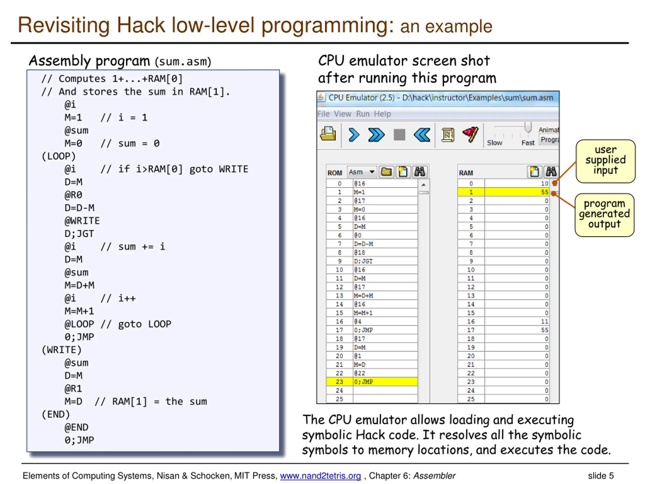 Revisiting Hack low-level programming: an example Assembly program (sum.asm) CPU emulator screen shot after running this program // Computes 1+...+RAM[0] // And stores the sum in RAM[1]. @i M=1 // i = 1 @sum M=0 // sum = 0 (LOOP) @i // if i>RAM[0] goto WRITE D=M @R0 D=D-M @WRITE D;JGT @i // sum += i D=M @sum M=D+M @i // i++ M=M+1 @LOOP // goto LOOP 0;JMP (WRITE) @sum D=M @R1 M=D // RAM[1] = the sum (END) @END 0;JMP user supplied input program generated output The CPU emulator allows loading and executing symbolic Hack code. It resolves all the symbolic symbols to memory locations, and executes the code. www.nand2tetris.org Elements of Computing Systems, Nisan & Schocken, MIT Press, www.nand2tetris.org , Chapter 6: Assembler slide 5