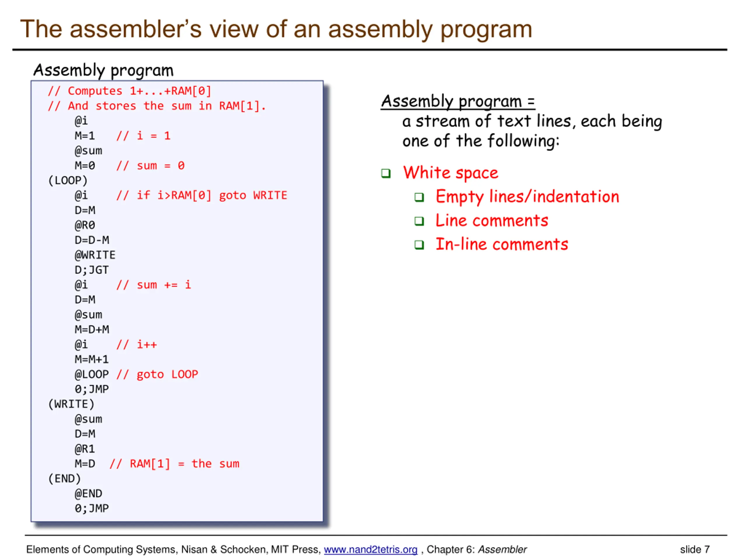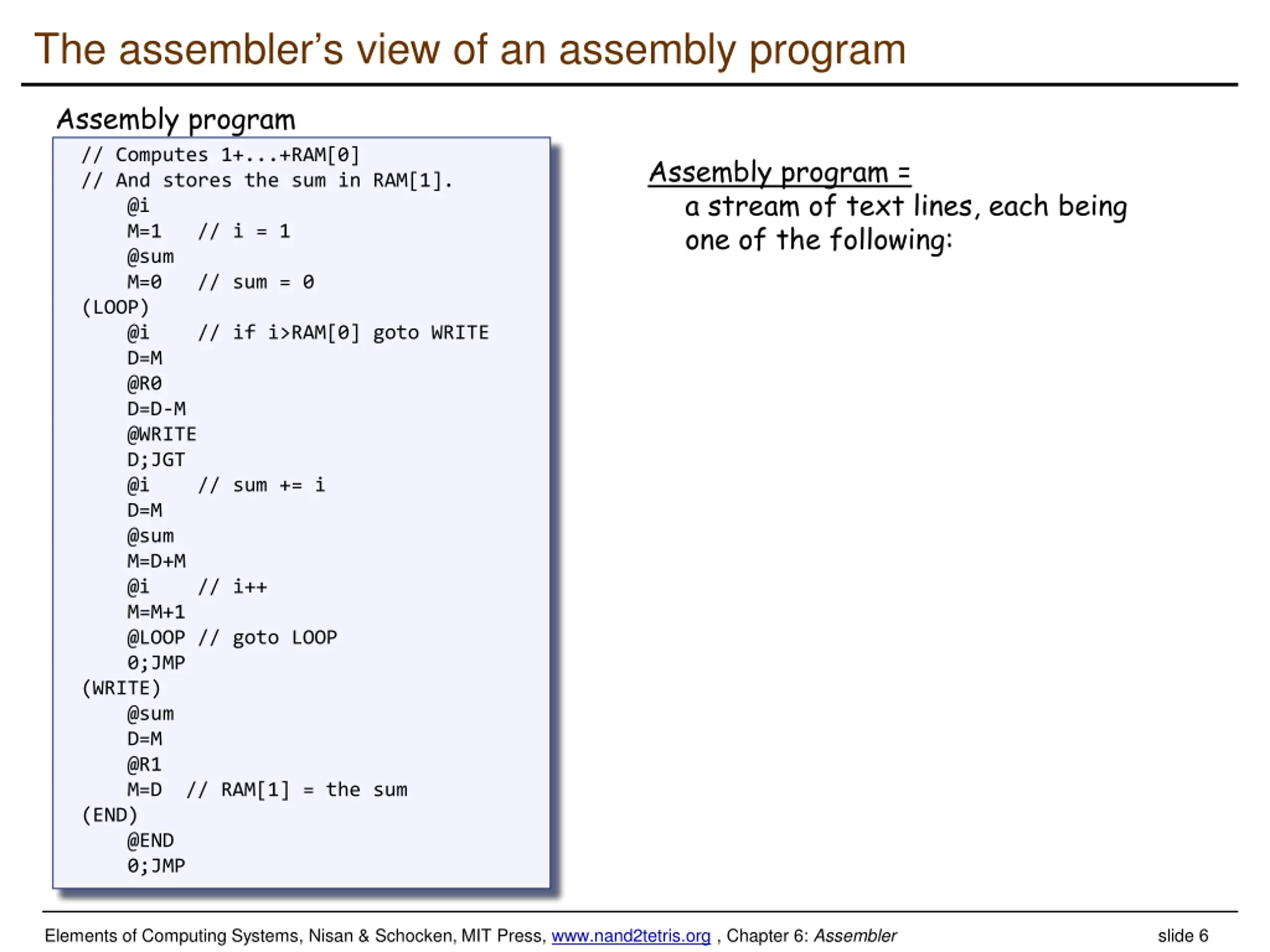 The assemblers view of an assembly program Assembly program // Computes 1+...+RAM[0] // And stores the sum in RAM[1]. @i M=1 // i = 1 @sum M=0 // sum = 0 (LOOP) @i // if i>RAM[0] goto WRITE D=M @R0 D=D-M @WRITE D;JGT @i // sum += i D=M @sum M=D+M @i // i++ M=M+1 @LOOP // goto LOOP 0;JMP (WRITE) @sum D=M @R1 M=D // RAM[1] = the sum (END) @END 0;JMP Assembly program = a stream of text lines, each being one of the following: www.nand2tetris.org Elements of Computing Systems, Nisan & Schocken, MIT Press, www.nand2tetris.org , Chapter 6: Assembler slide 6