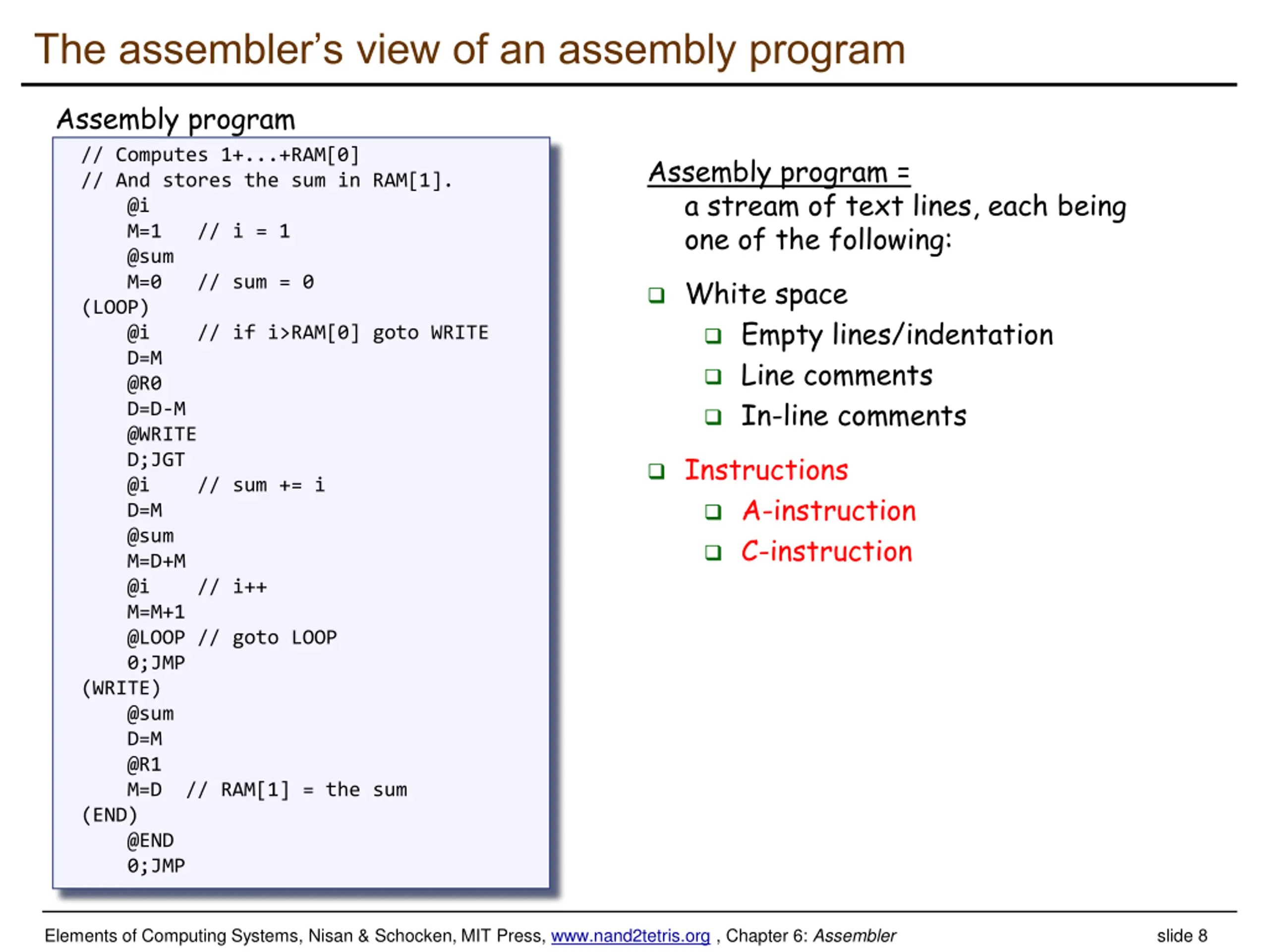 The assemblers view of an assembly program Assembly program // Computes 1+...+RAM[0] // And stores the sum in RAM[1]. @i M=1 // i = 1 @sum M=0 // sum = 0 (LOOP) @i // if i>RAM[0] goto WRITE D=M @R0 D=D-M @WRITE D;JGT @i // sum += i D=M @sum M=D+M @i // i++ M=M+1 @LOOP // goto LOOP 0;JMP (WRITE) @sum D=M @R1 M=D // RAM[1] = the sum (END) @END 0;JMP Assembly program = a stream of text lines, each being one of the following: White space Empty lines/indentation Line comments In-line comments www.nand2tetris.org Elements of Computing Systems, Nisan & Schocken, MIT Press, www.nand2tetris.org , Chapter 6: Assembler slide 7