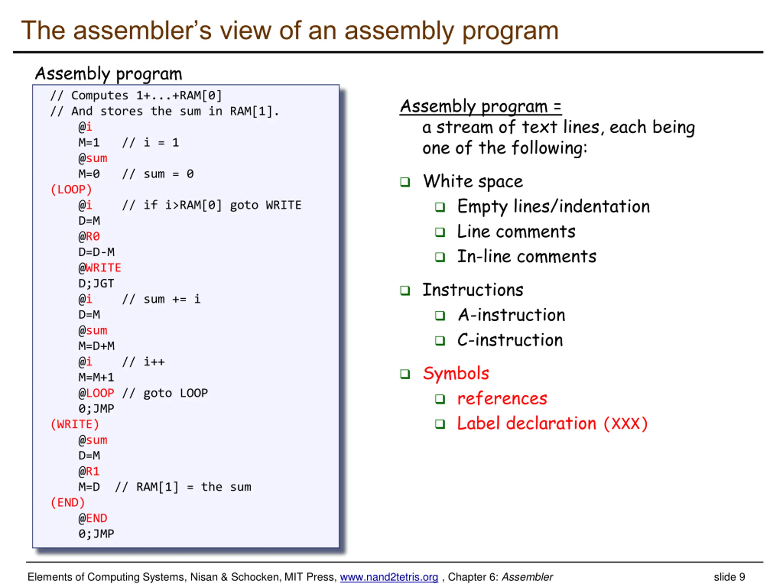 The assemblers view of an assembly program Assembly program // Computes 1+...+RAM[0] // And stores the sum in RAM[1]. @i M=1 // i = 1 @sum M=0 // sum = 0 (LOOP) @i // if i>RAM[0] goto WRITE D=M @R0 D=D-M @WRITE D;JGT @i // sum += i D=M @sum M=D+M @i // i++ M=M+1 @LOOP // goto LOOP 0;JMP (WRITE) @sum D=M @R1 M=D // RAM[1] = the sum (END) @END 0;JMP Assembly program = a stream of text lines, each being one of the following: White space Empty lines/indentation Line comments In-line comments Instructions A-instruction C-instruction www.nand2tetris.org Elements of Computing Systems, Nisan & Schocken, MIT Press, www.nand2tetris.org , Chapter 6: Assembler slide 8