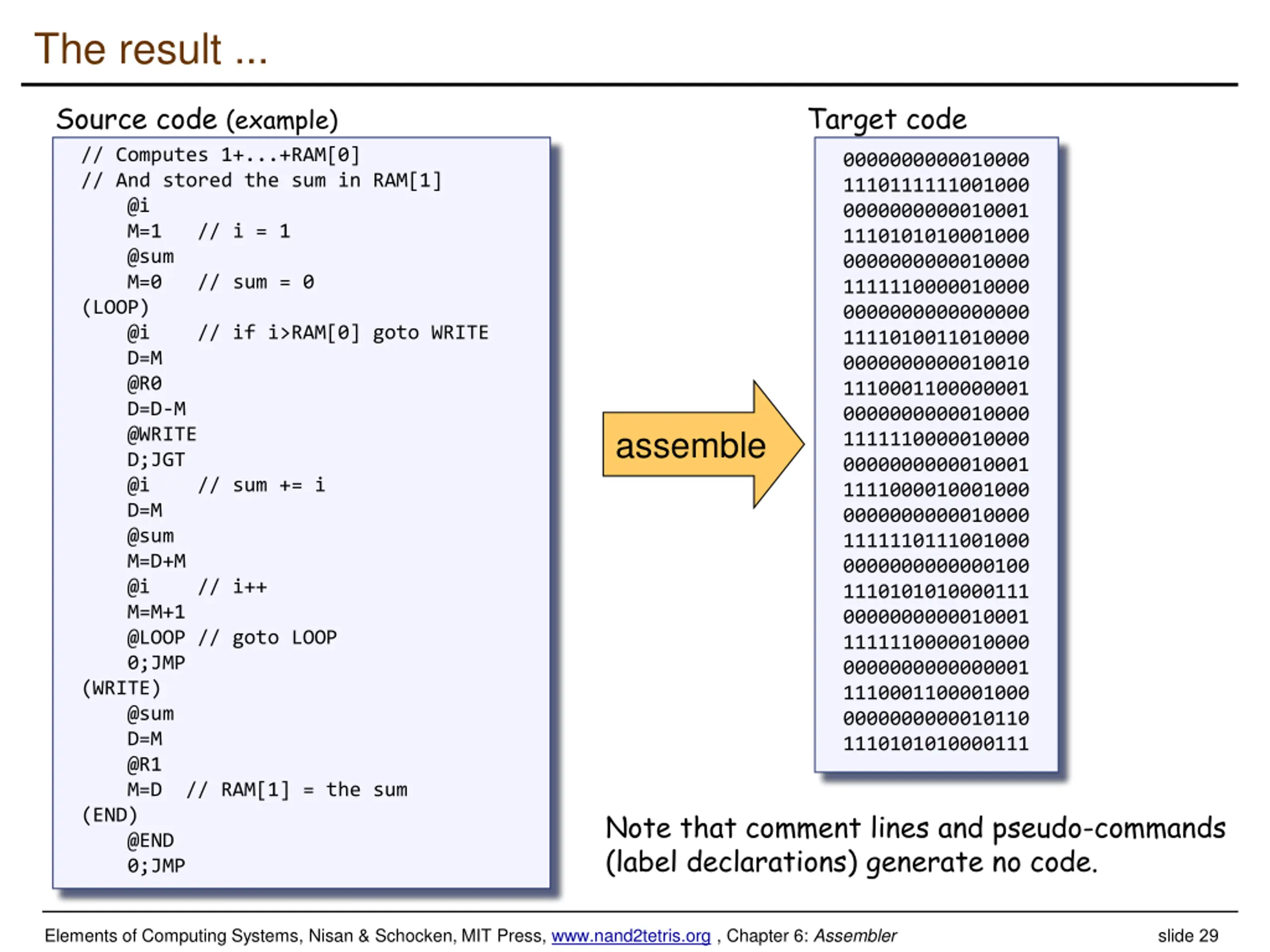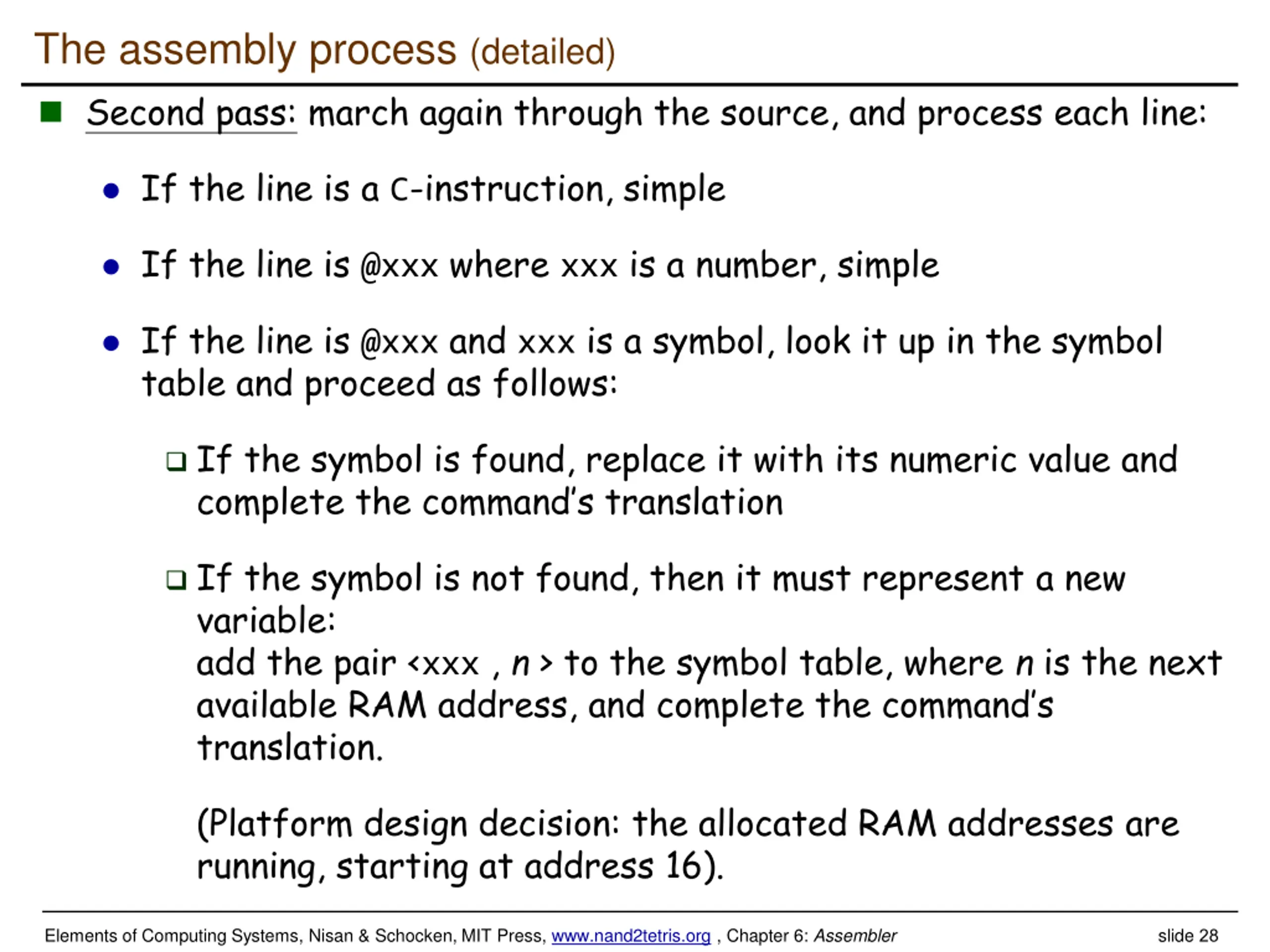 The assembly process (detailed) Second pass: march again through the source, and process each line: If the line is a C-instruction, simple If the line is @xxx where xxx is a number, simple If the line is @xxx and xxx is a symbol, look it up in the symbol table and proceed as follows: If the symbol is found, replace it with its numeric value and complete the command s translation If the symbol is not found, then it must represent a new variable: add the pair <xxx , n > to the symbol table, where n is the next available RAM address, and complete the command s translation. (Platform design decision: the allocated RAM addresses are running, starting at address 16). www.nand2tetris.org Elements of Computing Systems, Nisan & Schocken, MIT Press, www.nand2tetris.org , Chapter 6: Assembler slide 28