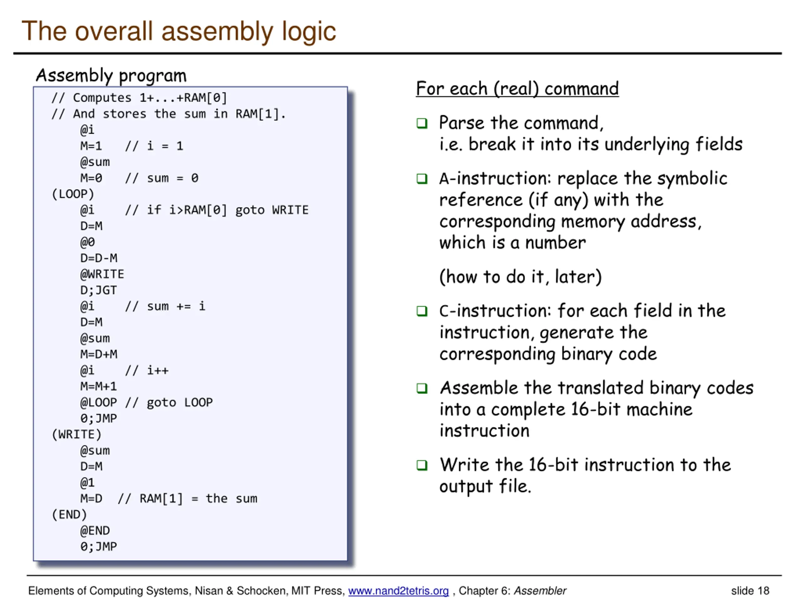 The overall assembly logic Assembly program For each (real) command // Computes 1+...+RAM[0] // And stores the sum in RAM[1]. @i M=1 // i = 1 @sum M=0 // sum = 0 (LOOP) @i // if i>RAM[0] goto WRITE D=M @0 D=D-M @WRITE D;JGT @i // sum += i D=M @sum M=D+M @i // i++ M=M+1 @LOOP // goto LOOP 0;JMP (WRITE) @sum D=M @1 M=D // RAM[1] = the sum (END) @END 0;JMP Parse the command, i.e. break it into its underlying fields A-instruction: replace the symbolic reference (if any) with the corresponding memory address, which is a number (how to do it, later) C-instruction: for each field in the instruction, generate the corresponding binary code Assemble the translated binary codes into a complete 16-bit machine instruction Write the 16-bit instruction to the output file. www.nand2tetris.org Elements of Computing Systems, Nisan & Schocken, MIT Press, www.nand2tetris.org , Chapter 6: Assembler slide 18