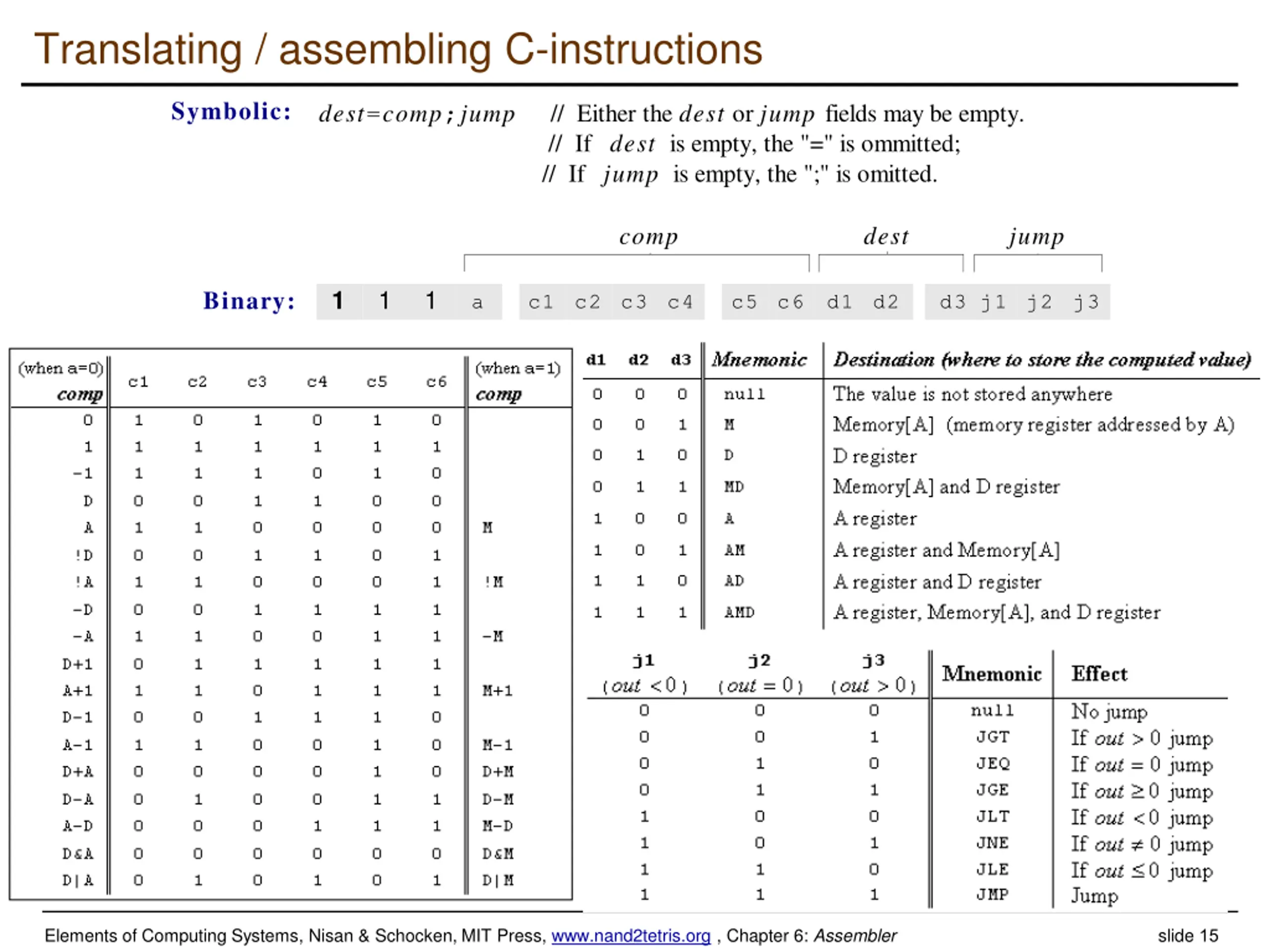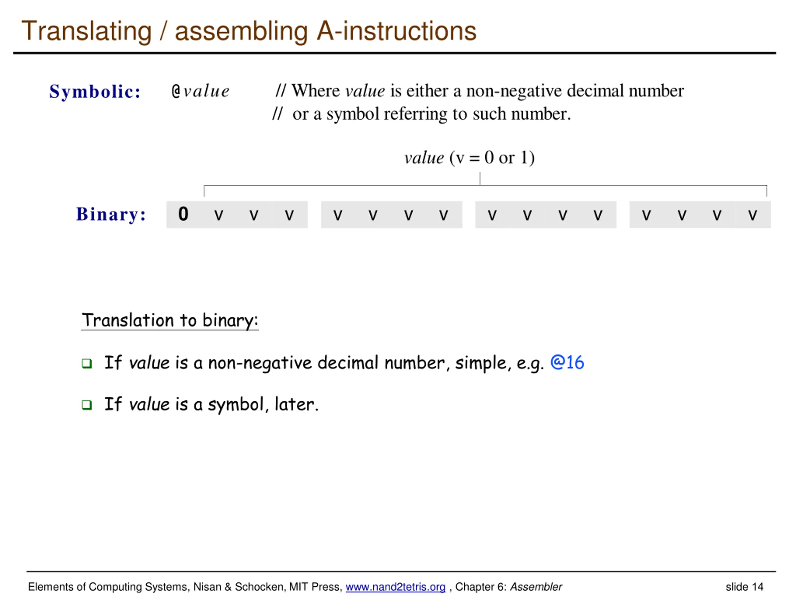 Translating / assembling A-instructions @value // Where value is either a non-negative decimal number // or a symbol referring to such number. Symbolic: value (v = 0 or 1) v v v v v v v v v v v v v v v 0 Binary: Translation to binary: If value is a non-negative decimal number, simple, e.g. @16 If value is a symbol, later. www.nand2tetris.org Elements of Computing Systems, Nisan & Schocken, MIT Press, www.nand2tetris.org , Chapter 6: Assembler slide 14