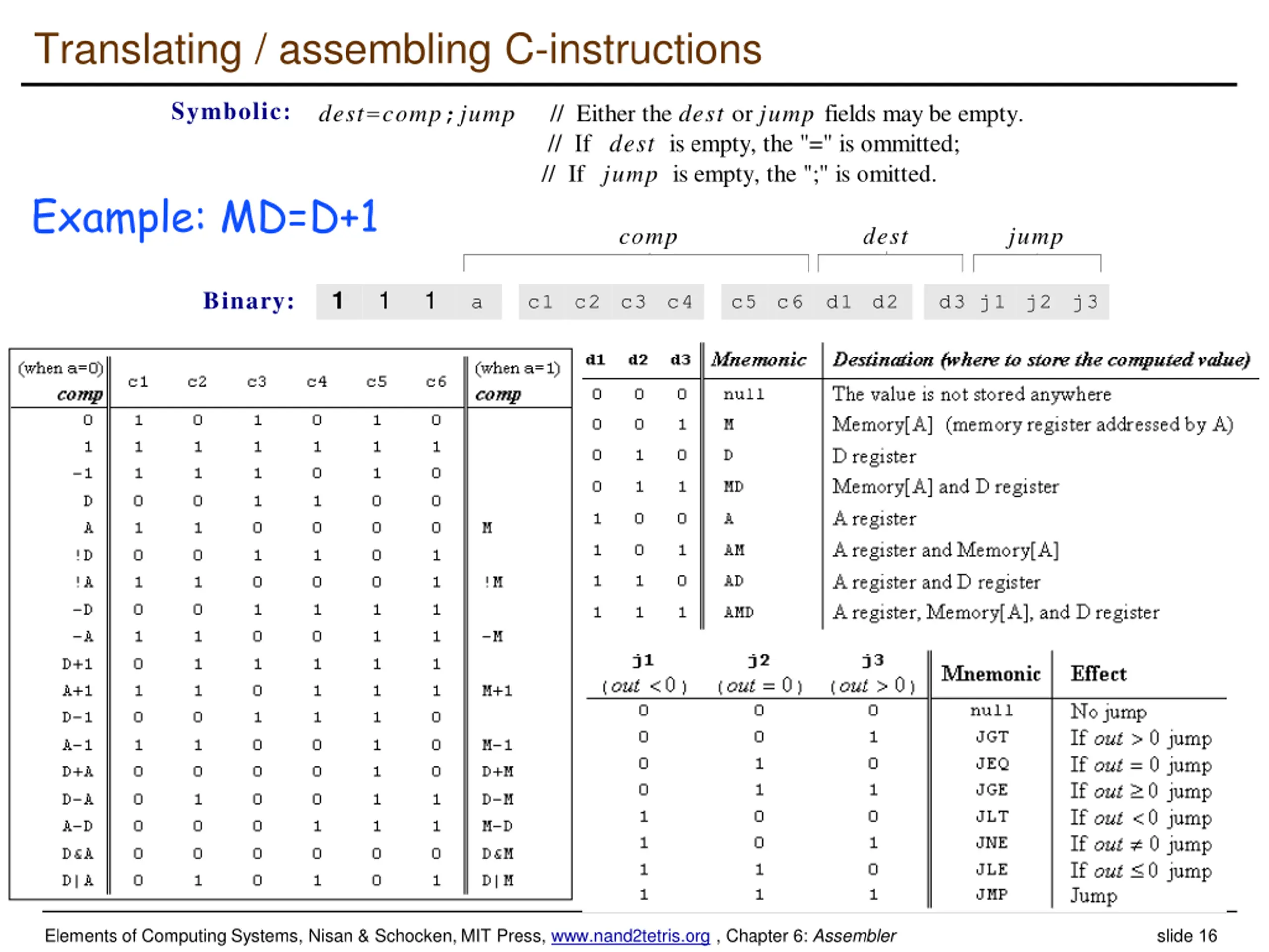 Translating / assembling C-instructions Symbolic: dest=comp;jump// Either the dest or jump fields may be empty. // If dest is empty, the "=" is ommitted; // If jump is empty, the ";" is omitted. comp dest jump 1 1 1 Binary: a c1 c2 c3 c4 c5 c6 d1 d2 d3 j1 j2 j3 www.nand2tetris.org Elements of Computing Systems, Nisan & Schocken, MIT Press, www.nand2tetris.org , Chapter 6: Assembler slide 15