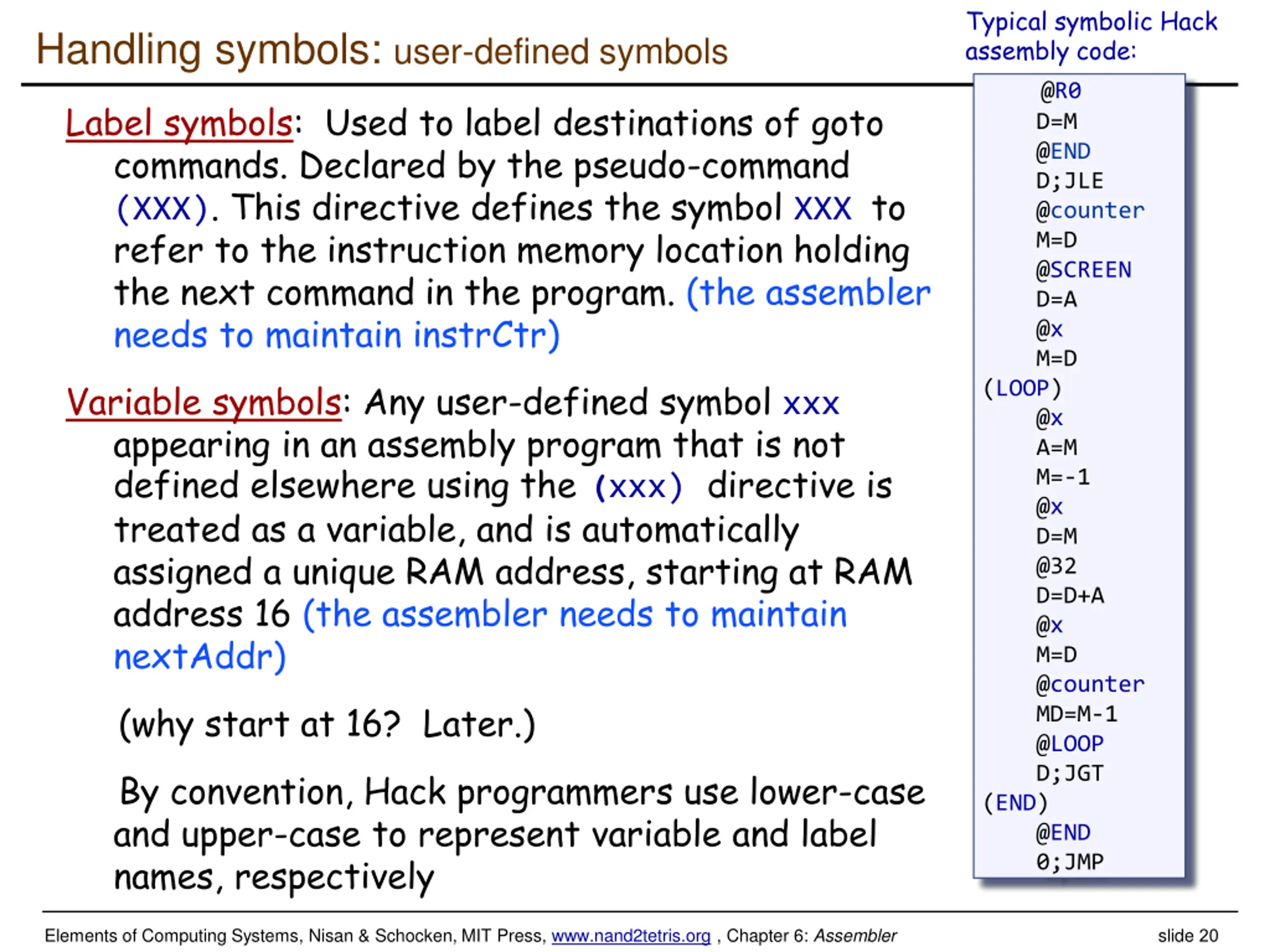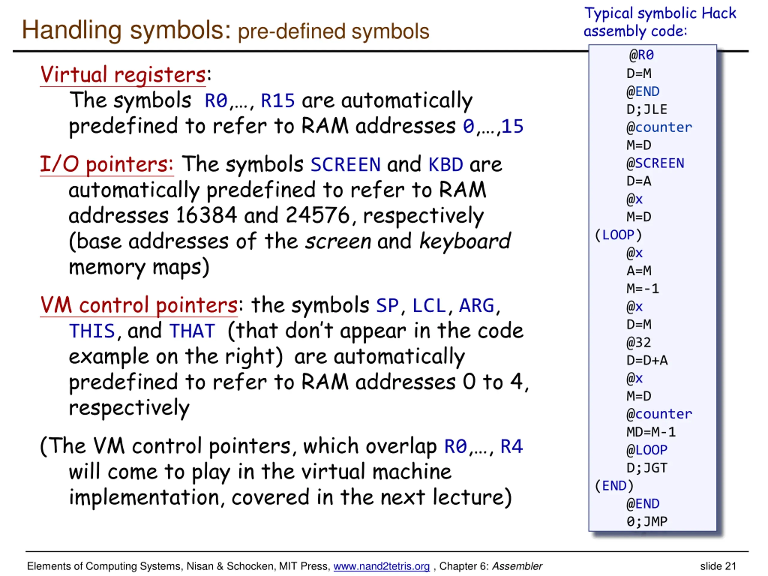 Typical symbolic Hack assembly code: Handling symbols: user-defined symbols @R0 D=M @END D;JLE @counter M=D @SCREEN D=A @x M=D Label symbols: Used to label destinations of goto commands. Declared by the pseudo-command (XXX). This directive defines the symbol XXX to refer to the instruction memory location holding the next command in the program. (the assembler needs to maintain instrCtr) Variable symbols: Any user-defined symbol xxx appearing in an assembly program that is not defined elsewhere using the (xxx) directive is treated as a variable, and is automatically assigned a unique RAM address, starting at RAM address 16 (the assembler needs to maintain nextAddr) (LOOP) @x A=M M=-1 @x D=M @32 D=D+A @x M=D @counter MD=M-1 @LOOP D;JGT (why start at 16? Later.) By convention, Hack programmers use lower-case and upper-case to represent variable and label names, respectively (END) @END 0;JMP www.nand2tetris.org Elements of Computing Systems, Nisan & Schocken, MIT Press, www.nand2tetris.org , Chapter 6: Assembler slide 20