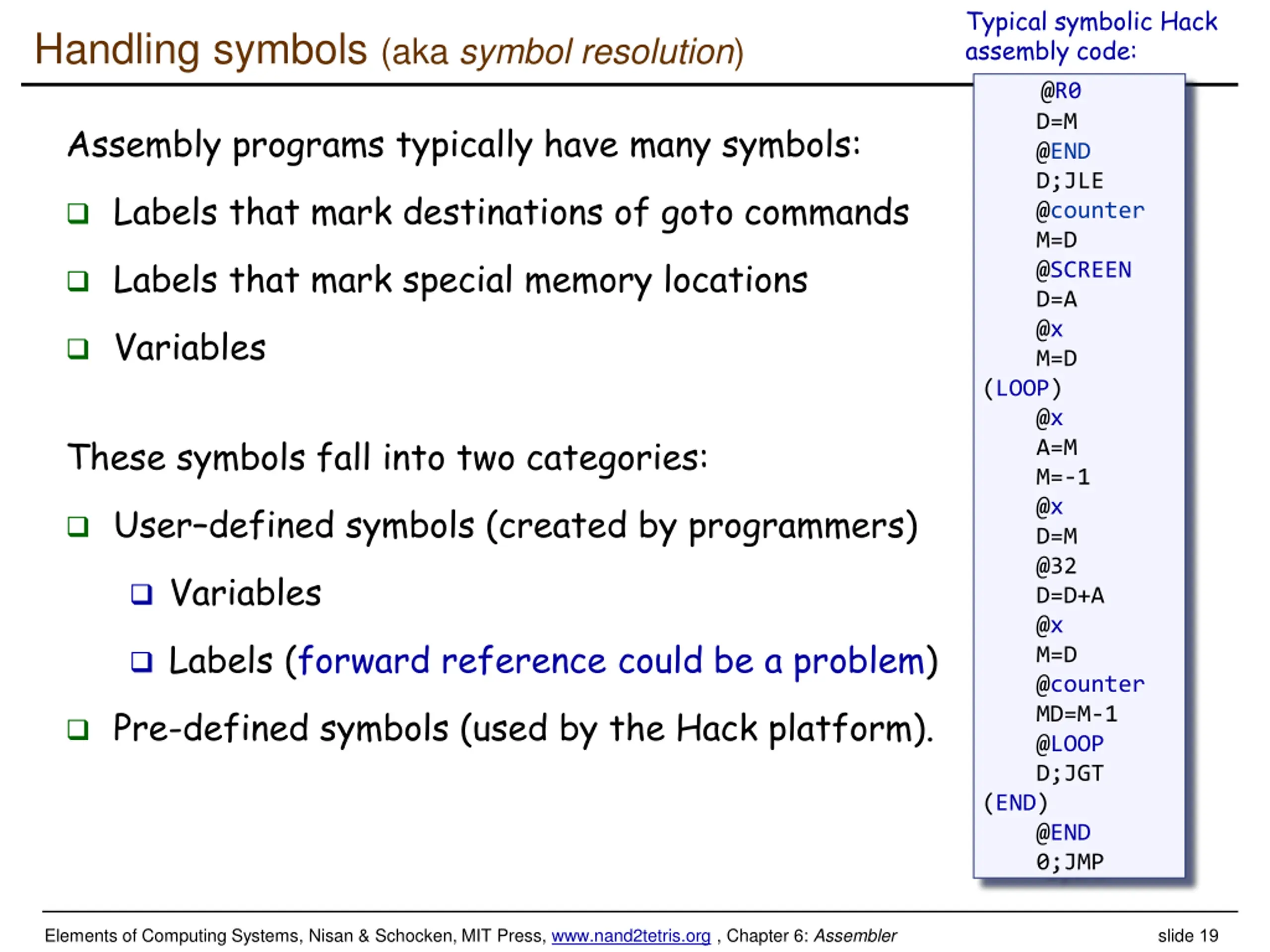 Typical symbolic Hack assembly code: Handling symbols (aka symbol resolution) @R0 D=M @END D;JLE @counter M=D @SCREEN D=A @x M=D Assembly programs typically have many symbols: Labels that mark destinations of goto commands Labels that mark special memory locations Variables (LOOP) @x A=M M=-1 @x D=M @32 D=D+A @x M=D @counter MD=M-1 @LOOP D;JGT These symbols fall into two categories: User defined symbols (created by programmers) Variables Labels (forward reference could be a problem) Pre-defined symbols (used by the Hack platform). (END) @END 0;JMP www.nand2tetris.org Elements of Computing Systems, Nisan & Schocken, MIT Press, www.nand2tetris.org , Chapter 6: Assembler slide 19