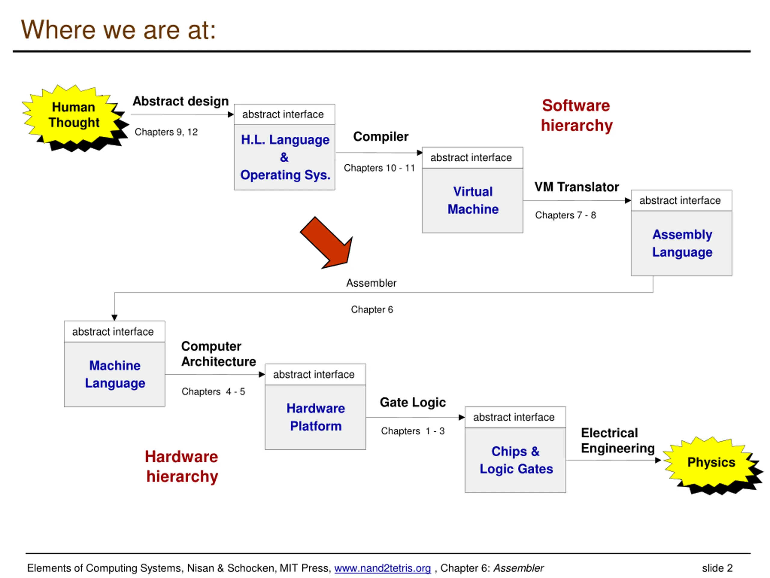 Where we are at: Abstract design Software hierarchy Human Thought abstract interface Chapters 9, 12 Compiler H.L. Language & Operating Sys. abstract interface Chapters 10 - 11 VM Translator Virtual Machine abstract interface Chapters 7 - 8 Assembly Language Assembler Chapter 6 abstract interface Computer Architecture Machine Language abstract interface Chapters 4 - 5 Gate Logic Hardware Platform abstract interface Chapters 1 - 3 Electrical Engineering Chips & Logic Gates Hardware hierarchy Physics www.nand2tetris.org Elements of Computing Systems, Nisan & Schocken, MIT Press, www.nand2tetris.org , Chapter 6: Assembler slide 2