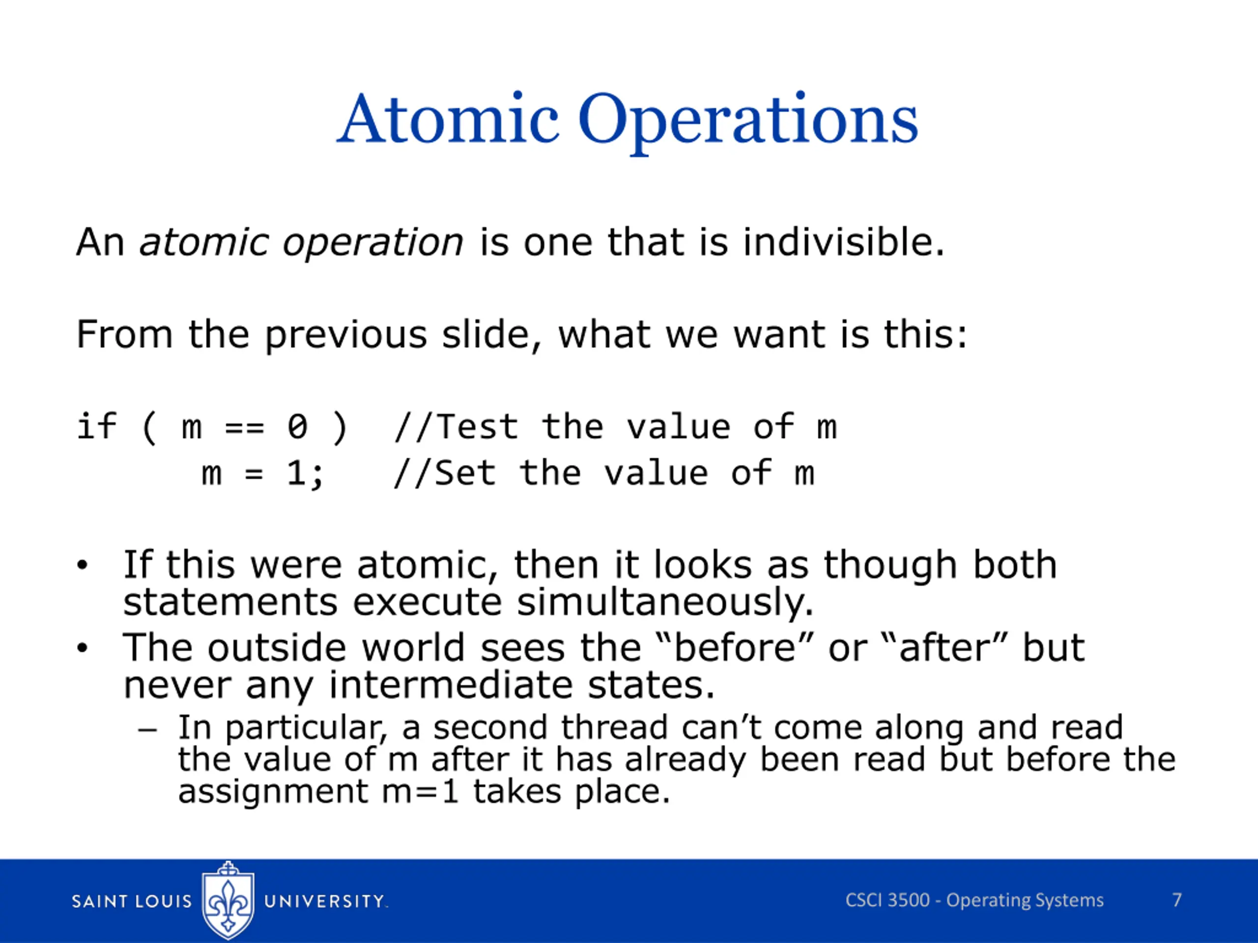 Atomic Operations An atomic operation is one that is indivisible. From the previous slide, what we want is this: if ( m == 0 ) //Test the value of m m = 1; //Set the value of m If this were atomic, then it looks as though both statements execute simultaneously. The outside world sees the before or after but never any intermediate states. In particular, a second thread can t come along and read the value of m after it has already been read but before the assignment m=1 takes place. CSCI 3500 - Operating Systems 7