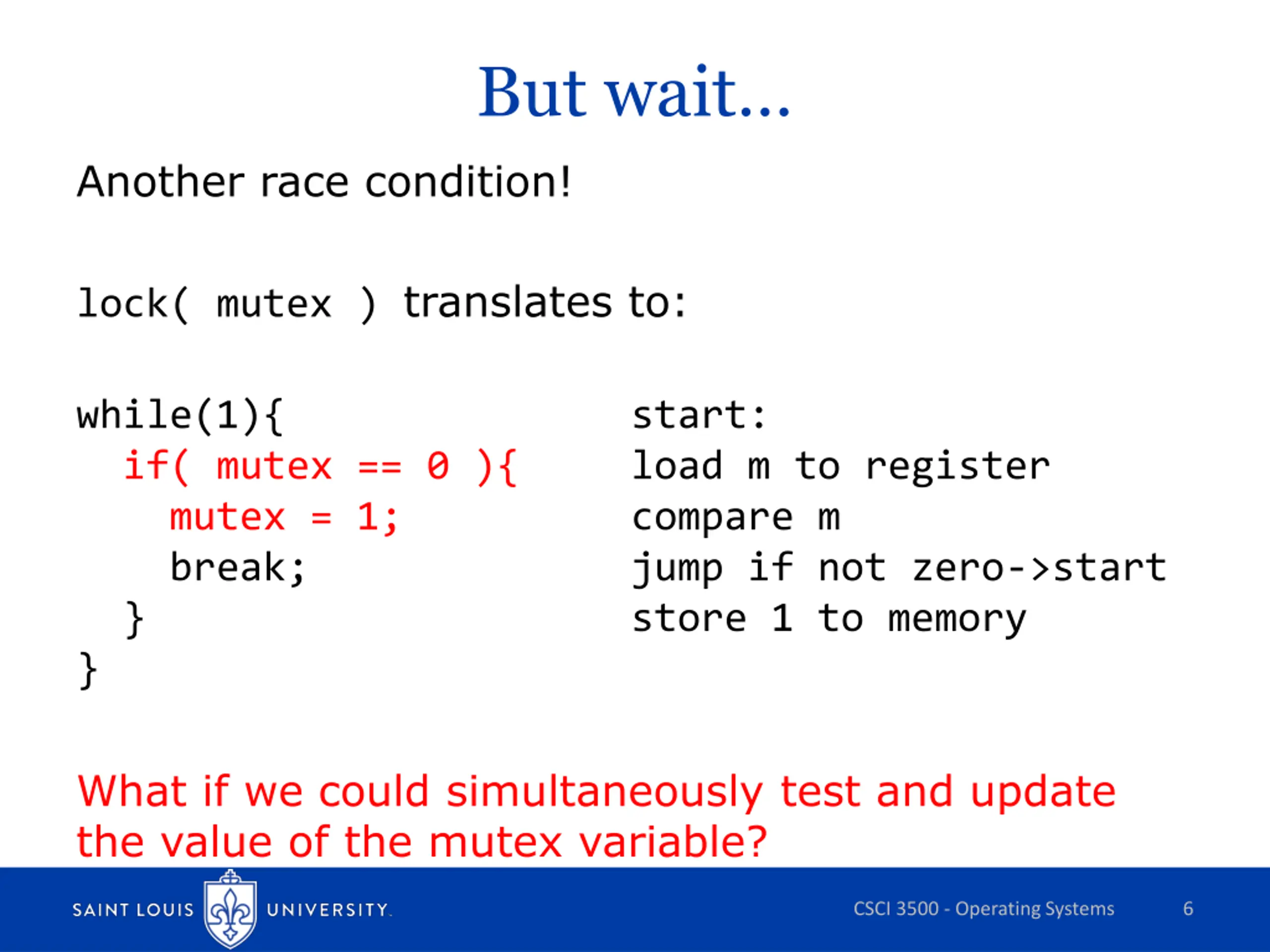 But wait Another race condition! lock( mutex ) translates to: while(1){ if( mutex == 0 ){ load m to register mutex = 1; break; } } start: compare m jump if not zero->start store 1 to memory What if we could simultaneously test and update the value of the mutex variable? CSCI 3500 - Operating Systems 6
