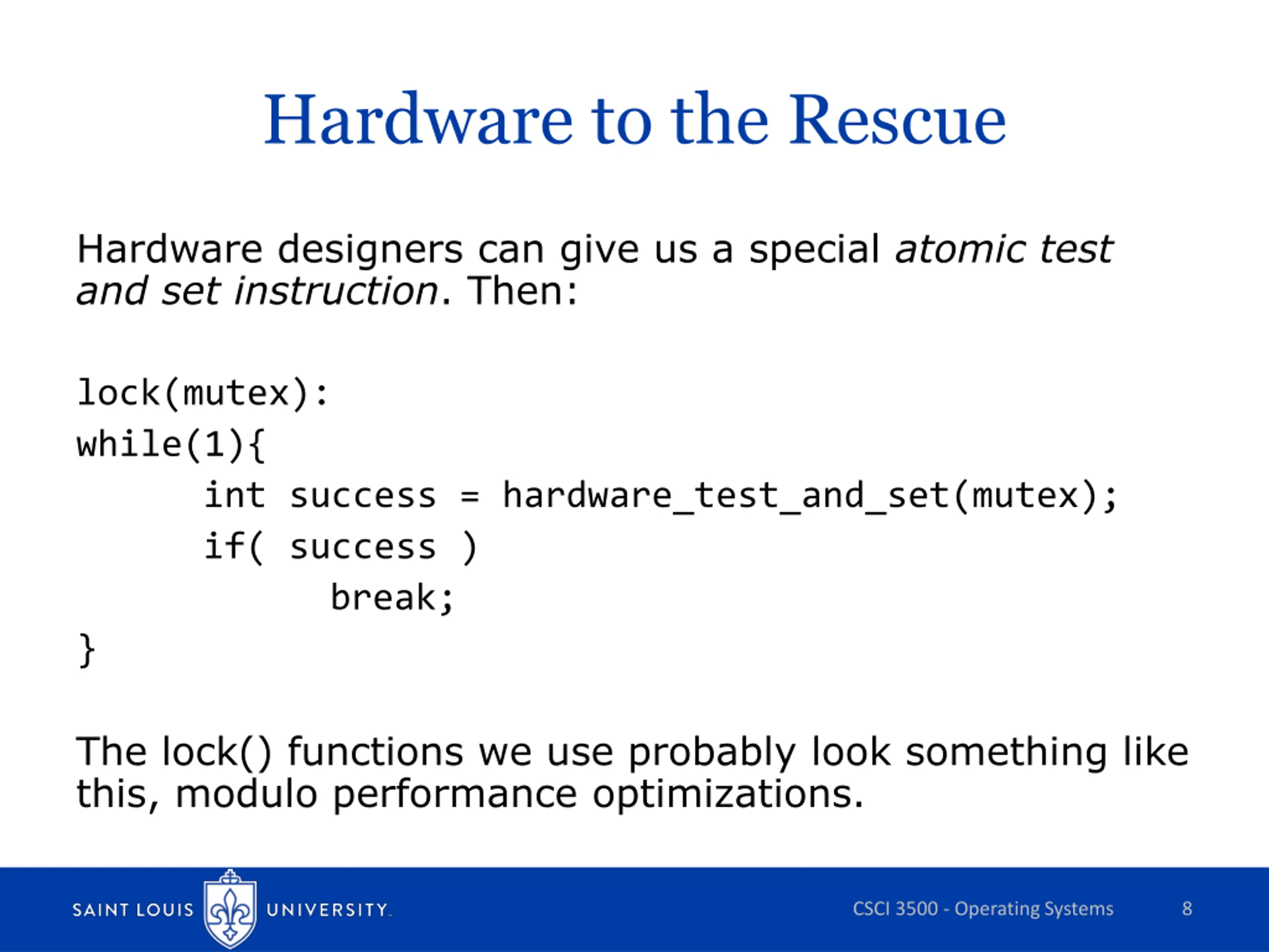 Hardware to the Rescue Hardware designers can give us a special atomic test and setinstruction. Then: lock(mutex): while(1){ int success = hardware_test_and_set(mutex); if( success ) break; } The lock() functions we use probably look something like this, modulo performance optimizations. CSCI 3500 - Operating Systems 8