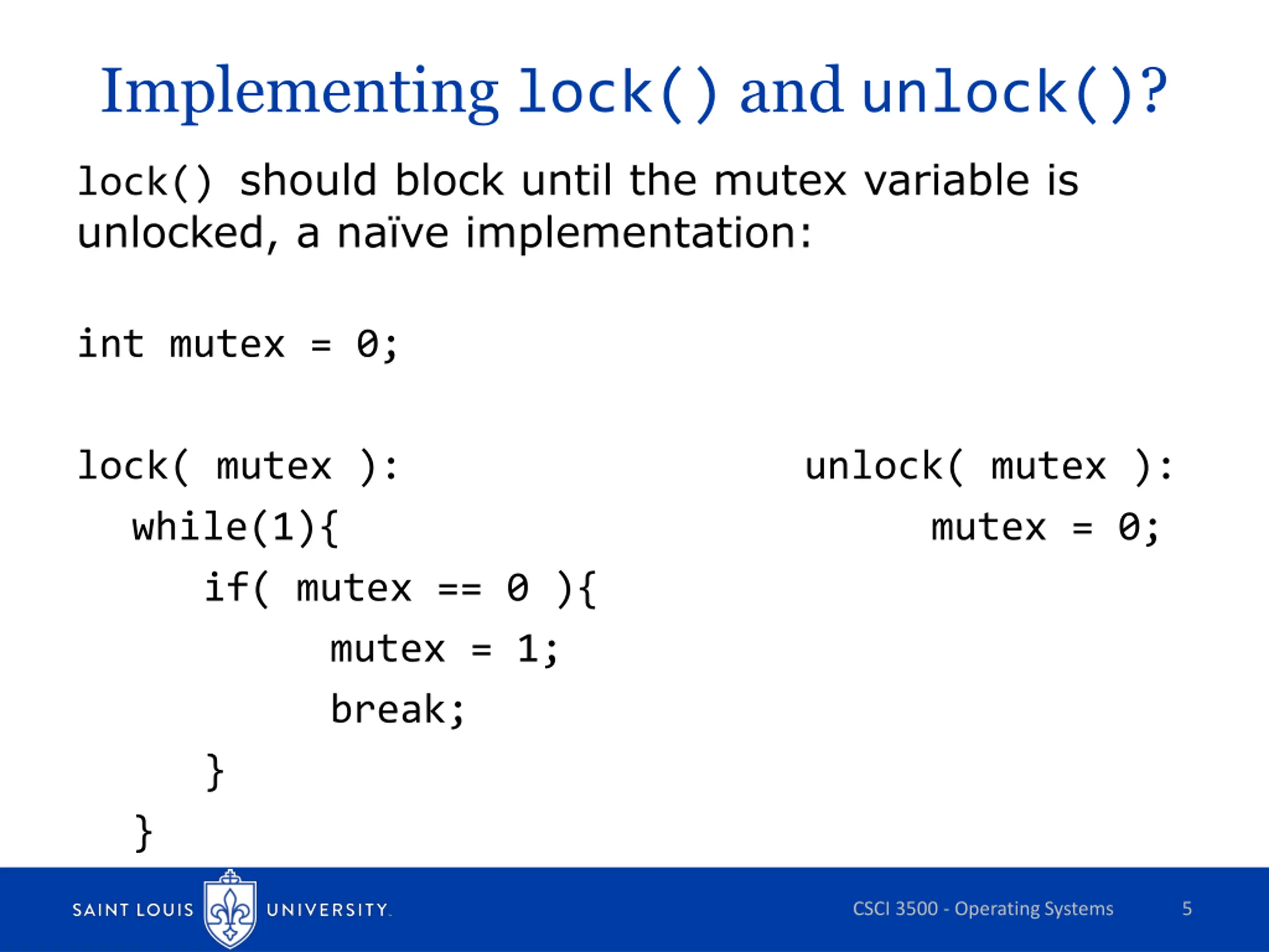 Implementing lock() and unlock()? lock() should block until the mutex variable is unlocked, a na ve implementation: int mutex = 0; lock( mutex ): while(1){ if( mutex == 0 ){ mutex = 1; break; } } unlock( mutex ): mutex = 0; CSCI 3500 - Operating Systems 5