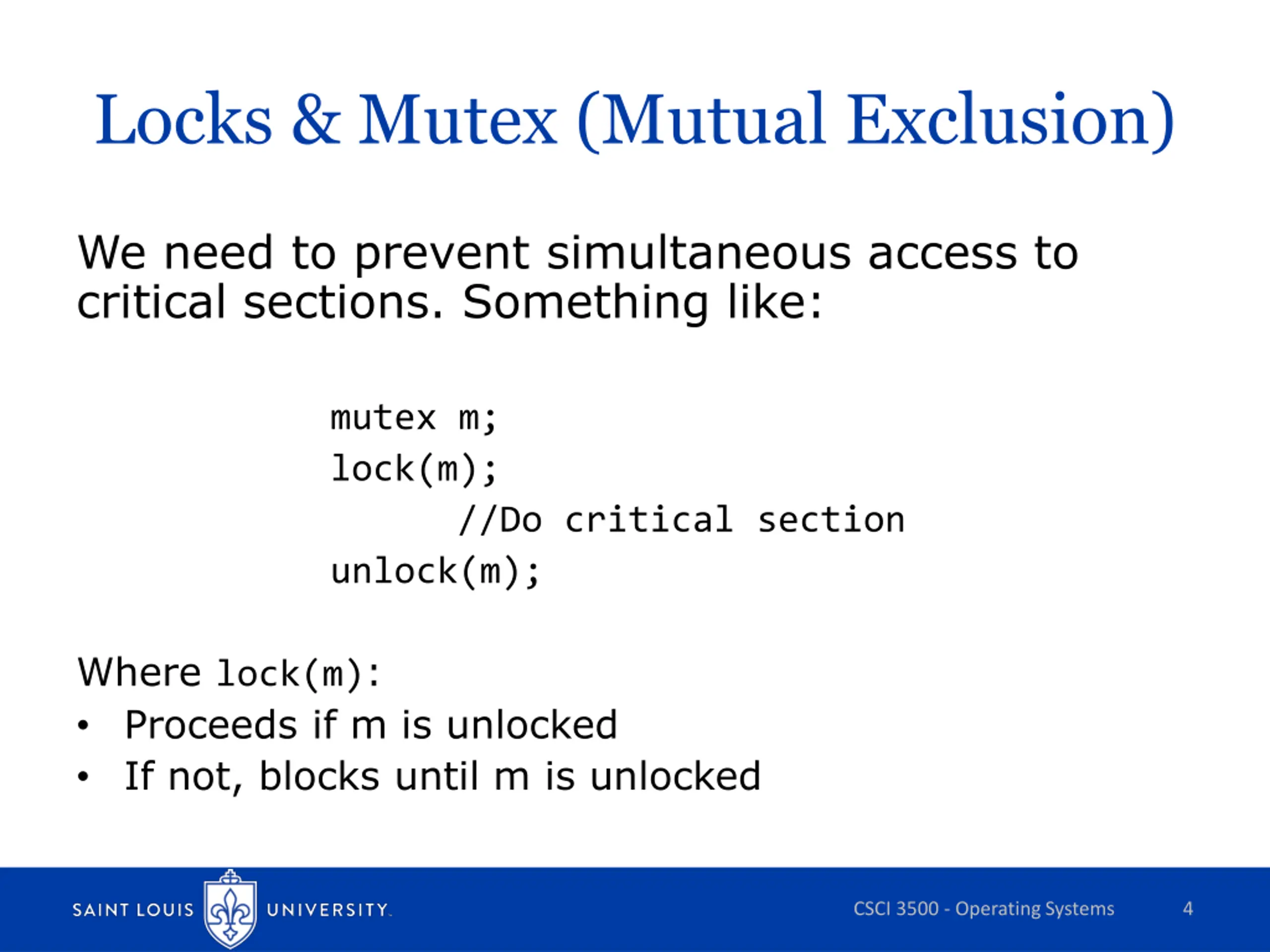 Locks & Mutex (Mutual Exclusion) We need to prevent simultaneous access to critical sections. Something like: mutex m; lock(m); unlock(m); //Do critical section Where lock(m): Proceeds if m is unlocked If not, blocks until m is unlocked CSCI 3500 - Operating Systems 4
