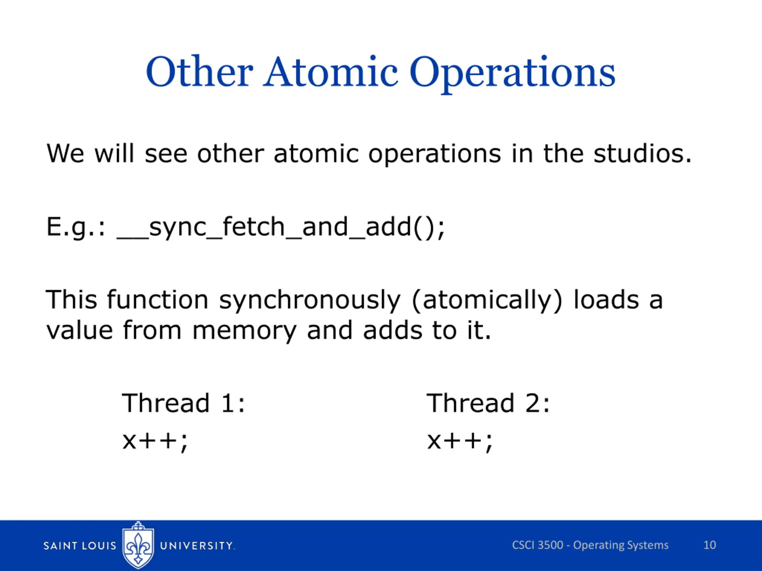 Other Atomic Operations We will see other atomic operations in the studios. E.g.: __sync_fetch_and_add(); This function synchronously (atomically) loads a value from memory and adds to it. Thread 1: x++; Thread 2: x++; CSCI 3500 - Operating Systems 10