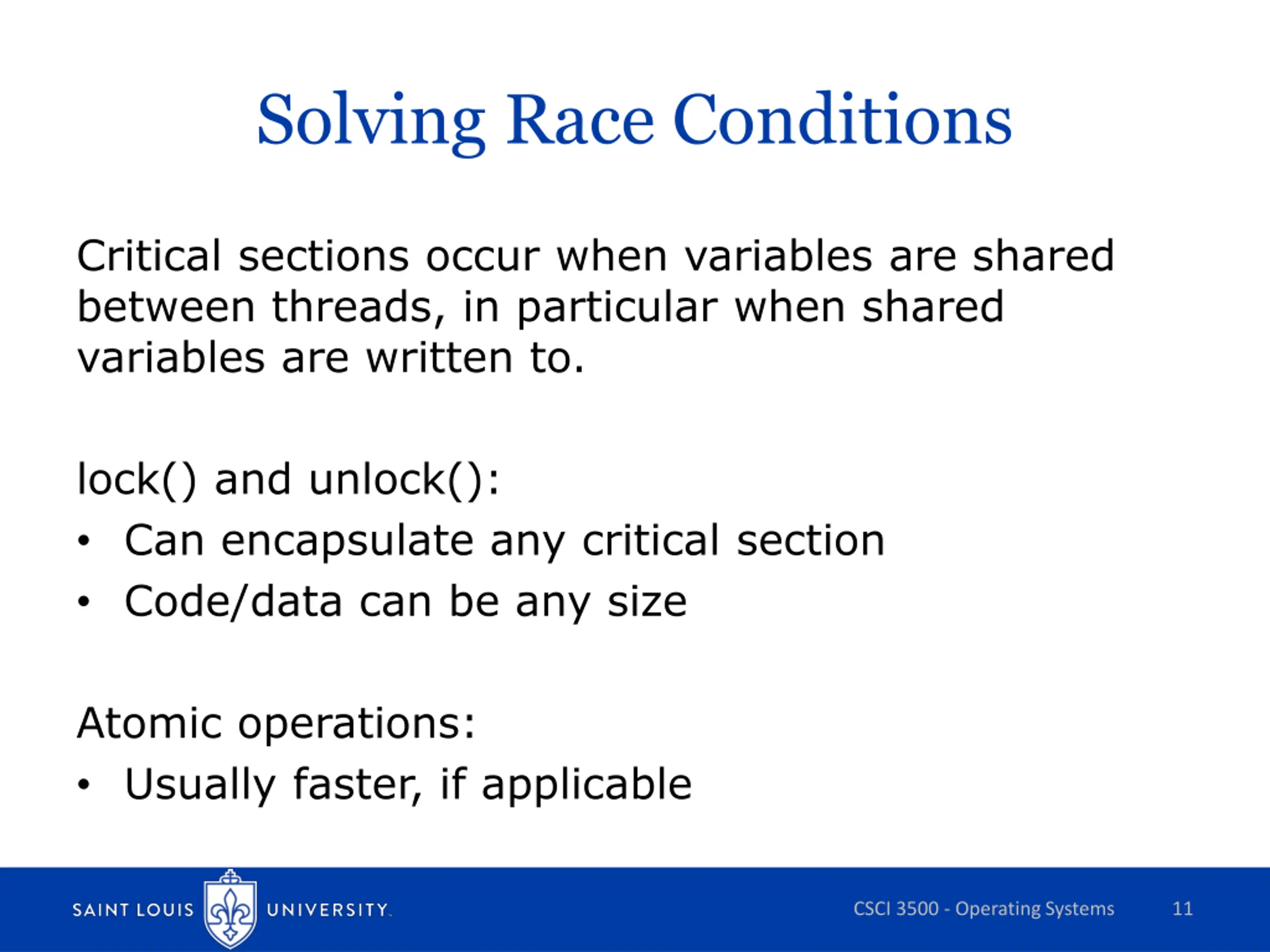 Solving Race Conditions Critical sections occur when variables are shared between threads, in particular when shared variables are written to. lock() and unlock(): Can encapsulate any critical section Code/data can be any size Atomic operations: Usually faster, if applicable CSCI 3500 - Operating Systems 11