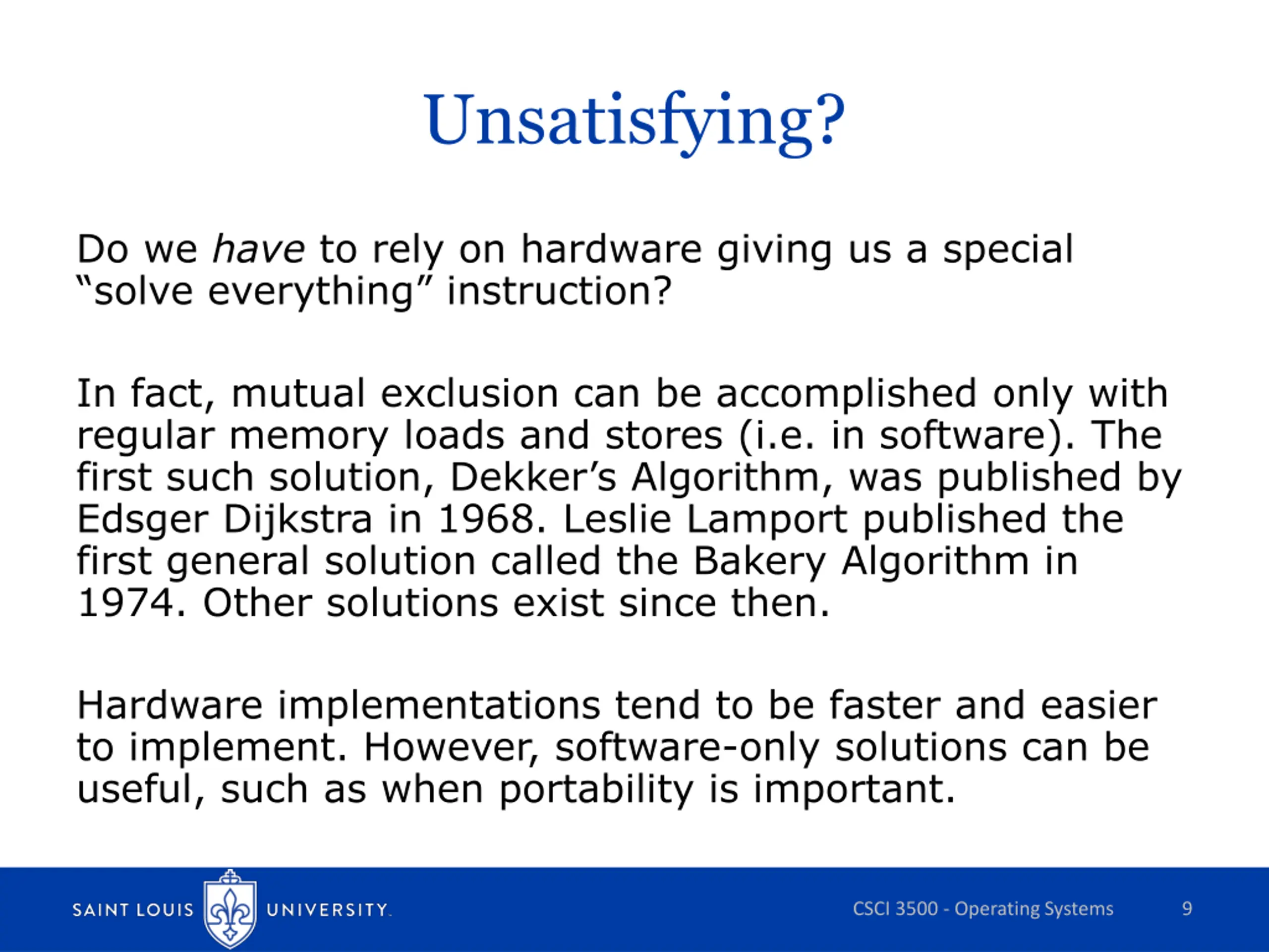 Unsatisfying? Do we have to rely on hardware giving us a special solve everything instruction? In fact, mutual exclusion can be accomplished only with regular memory loads and stores (i.e. in software). The first such solution, Dekker s Algorithm, was published by Edsger Dijkstra in 1968. Leslie Lamport published the first general solution called the Bakery Algorithm in 1974. Other solutions exist since then. Hardware implementations tend to be faster and easier to implement. However, software-only solutions can be useful, such as when portability is important. CSCI 3500 - Operating Systems 9