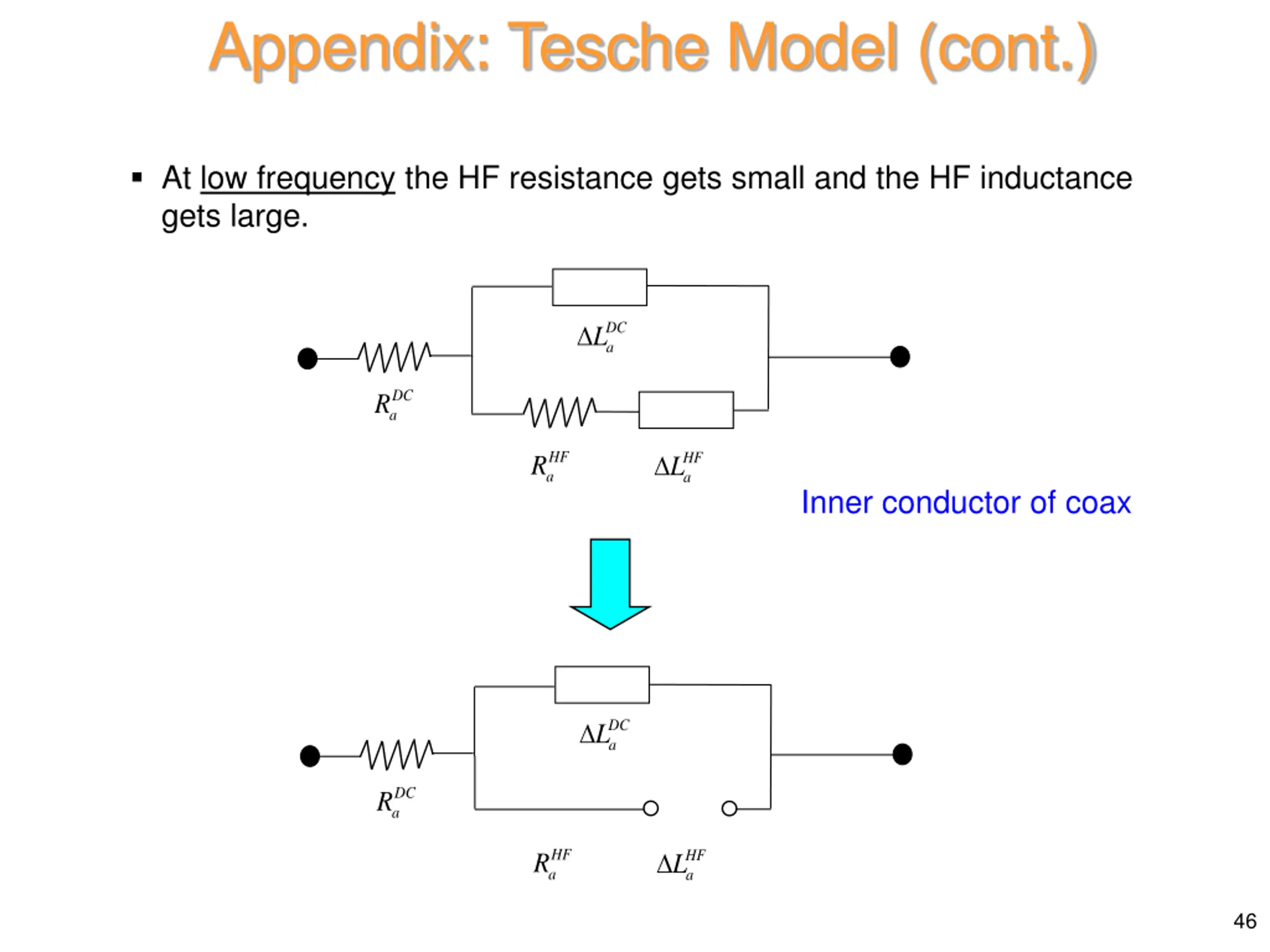 Appendix: Tesche Model (cont.) Z a Inner conductor of coax DC aL The impedance of this circuit is denoted as DC a R HF HF a R aL ( ) = + Z R j L a a a Z b Outer conductor of coax The impedance of this circuit is denoted as DC bL ( ) = + Z R j L DC b R b b b HF HF b R bL 45
