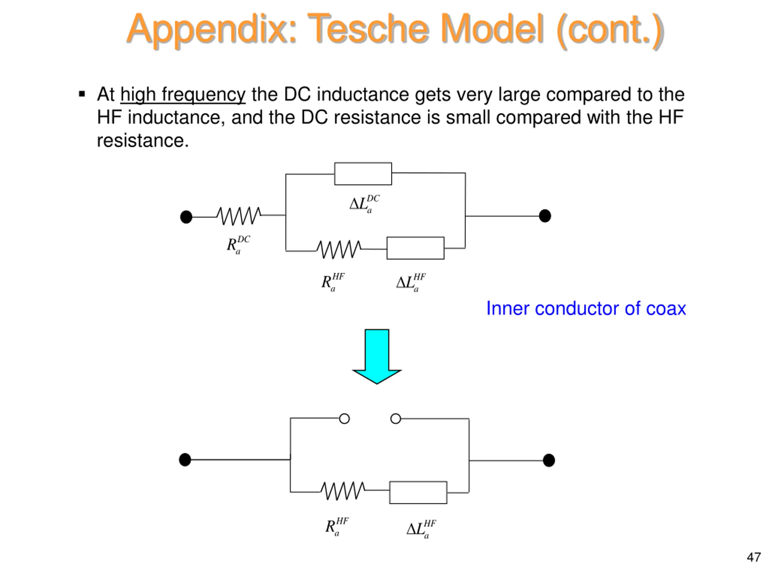Appendix: Tesche Model (cont.) At low frequency the HF resistance gets small and the HF inductance gets large. DC aL DC a R HF HF a R aL Inner conductor of coax DC aL DC a R HF HF a R aL 46