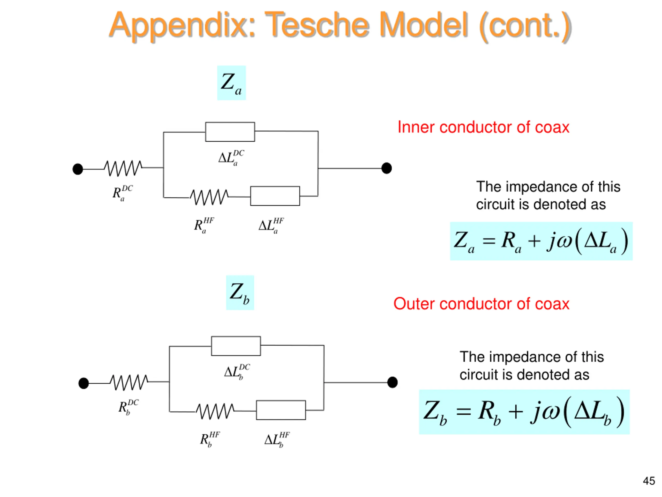 Appendix: Tesche Model The series elements Za and Zb (defined on the next slide) account for the finite conductivity, and give us an accurate R and L for each conductor at any frequency. Za Zb = + + j L Z Z Z G C L0 0 a b = + j C Y G z 2 c b a G C = 0 rc C = = = ln 0 tan L b a 0 2 ln c 44