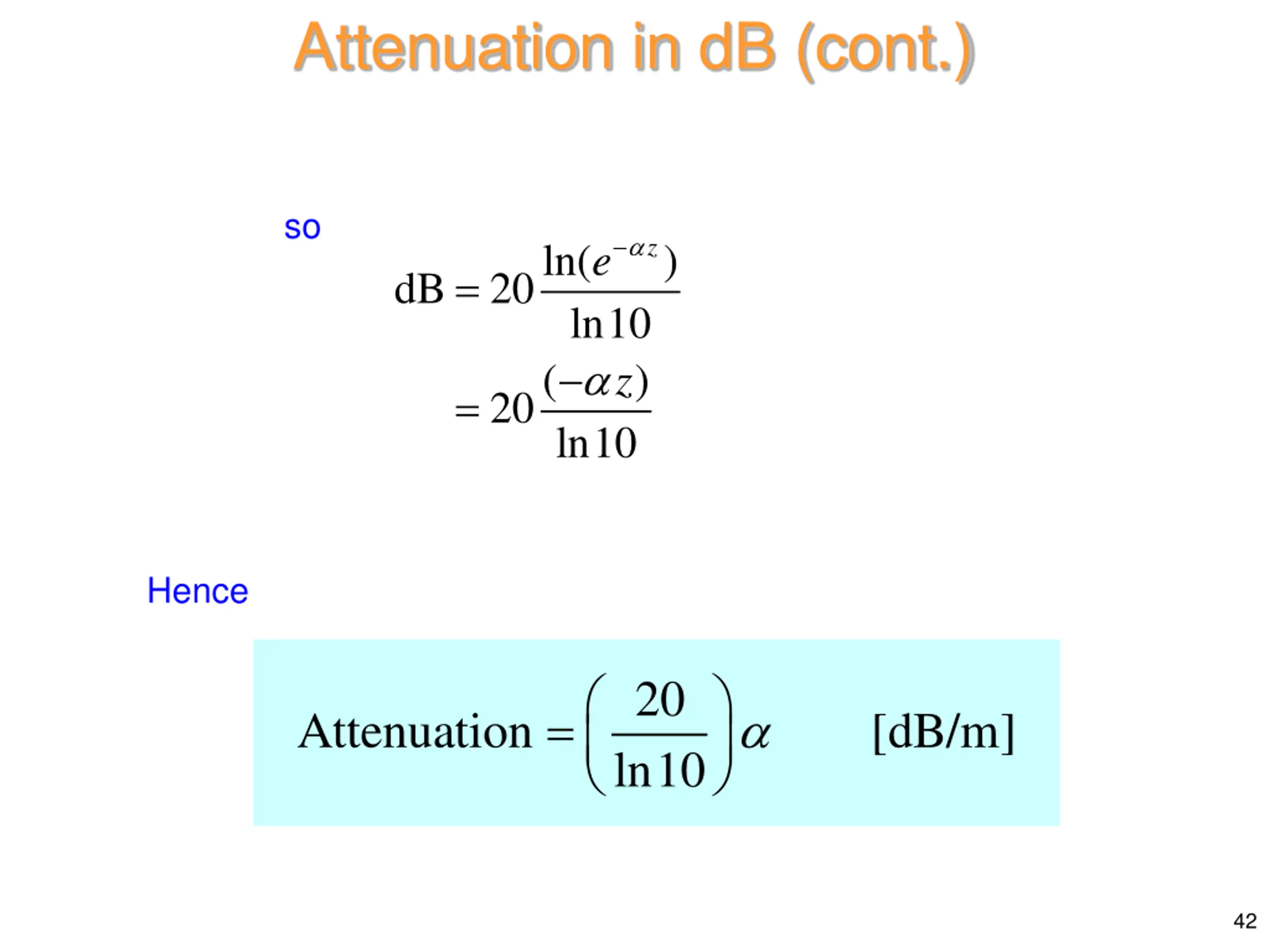 Attenuation in dB (cont.) so z ln( ) e = dB 20 ln10 ( ) z = 20 ln10 Hence 20 ln10 = Attenuation [dB/m] 42