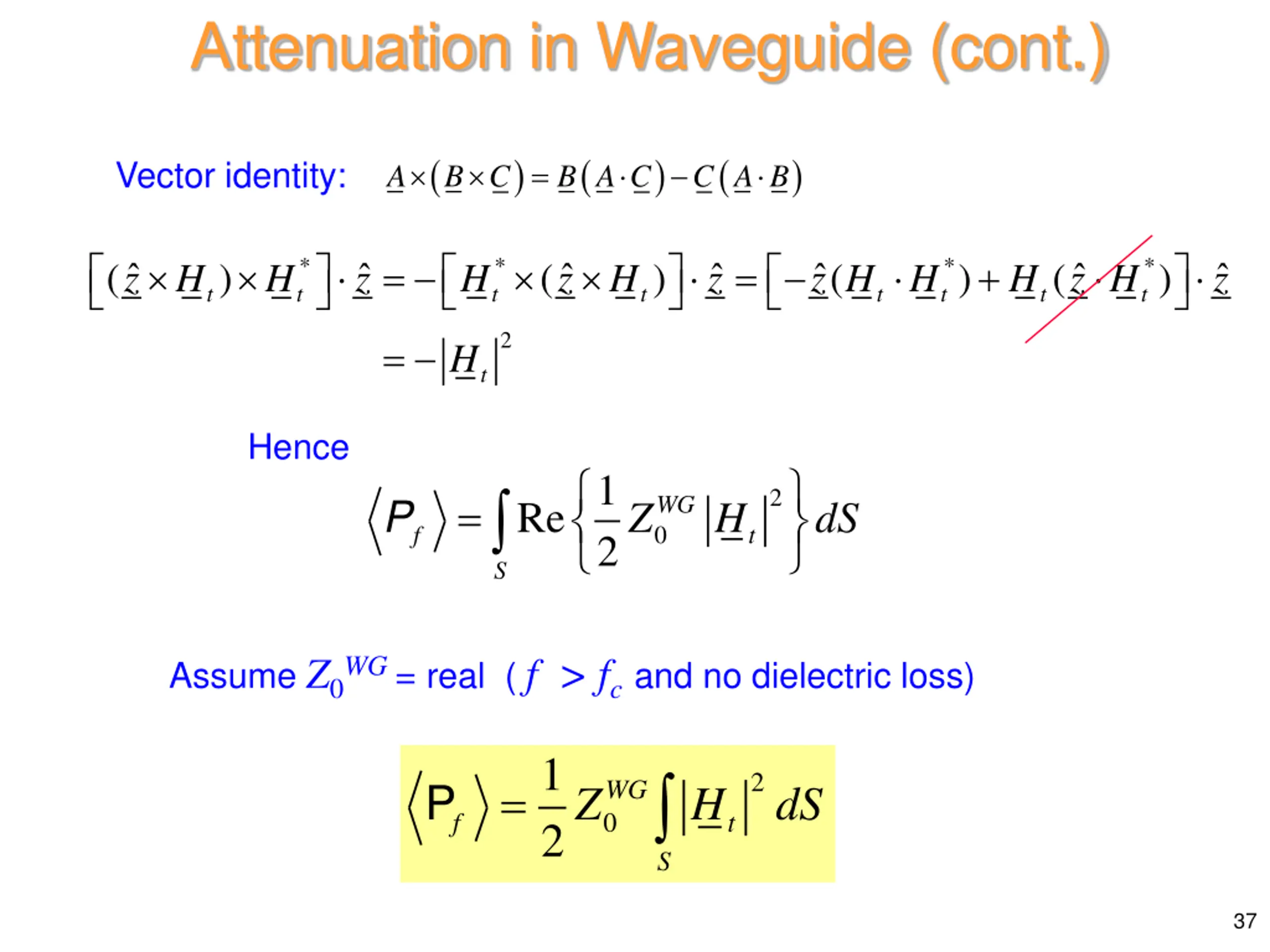 Attenuation in Waveguide (cont.) or 1 2 2 = R n H dl l P d s C Power flow: 1 2 = * t P z dS Re ( ) E H f t S Next, use ( ) = z H = WG WG TE TM ( ) or E Z Z Z Z 0 0 t t Hence 1 = z H * t WG P z dS Re ( ) Z H 0 f t 2 S 36