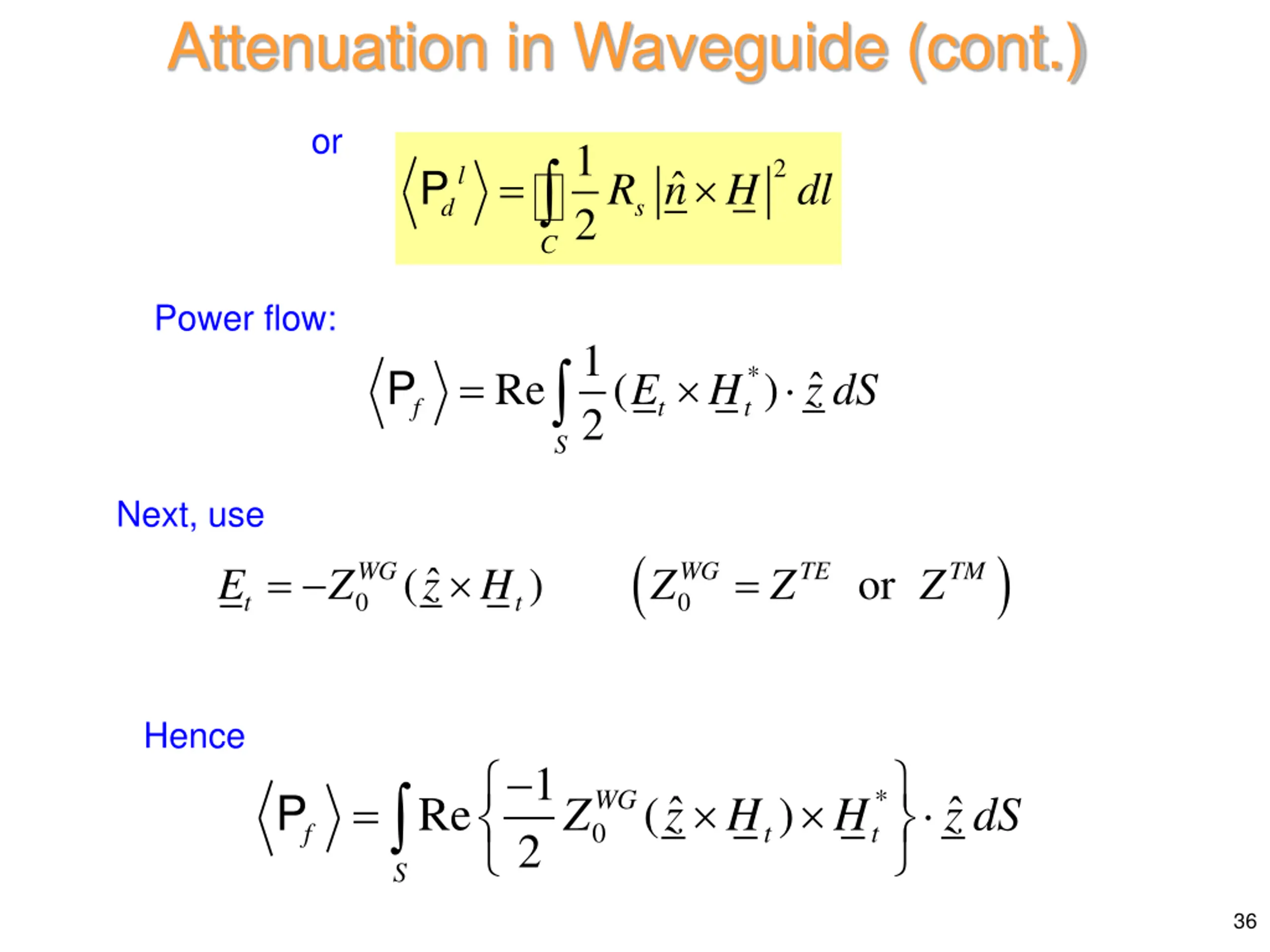 Attenuation in Waveguide We consider here conductor loss for a waveguide mode. A waveguide mode is traveling in the positive z direction. z S c S z C 1 1 2 2 = l P R J dS l P s d s d P z = S c c 2 1 2 f ( ) 2 = R J dl s s C 35