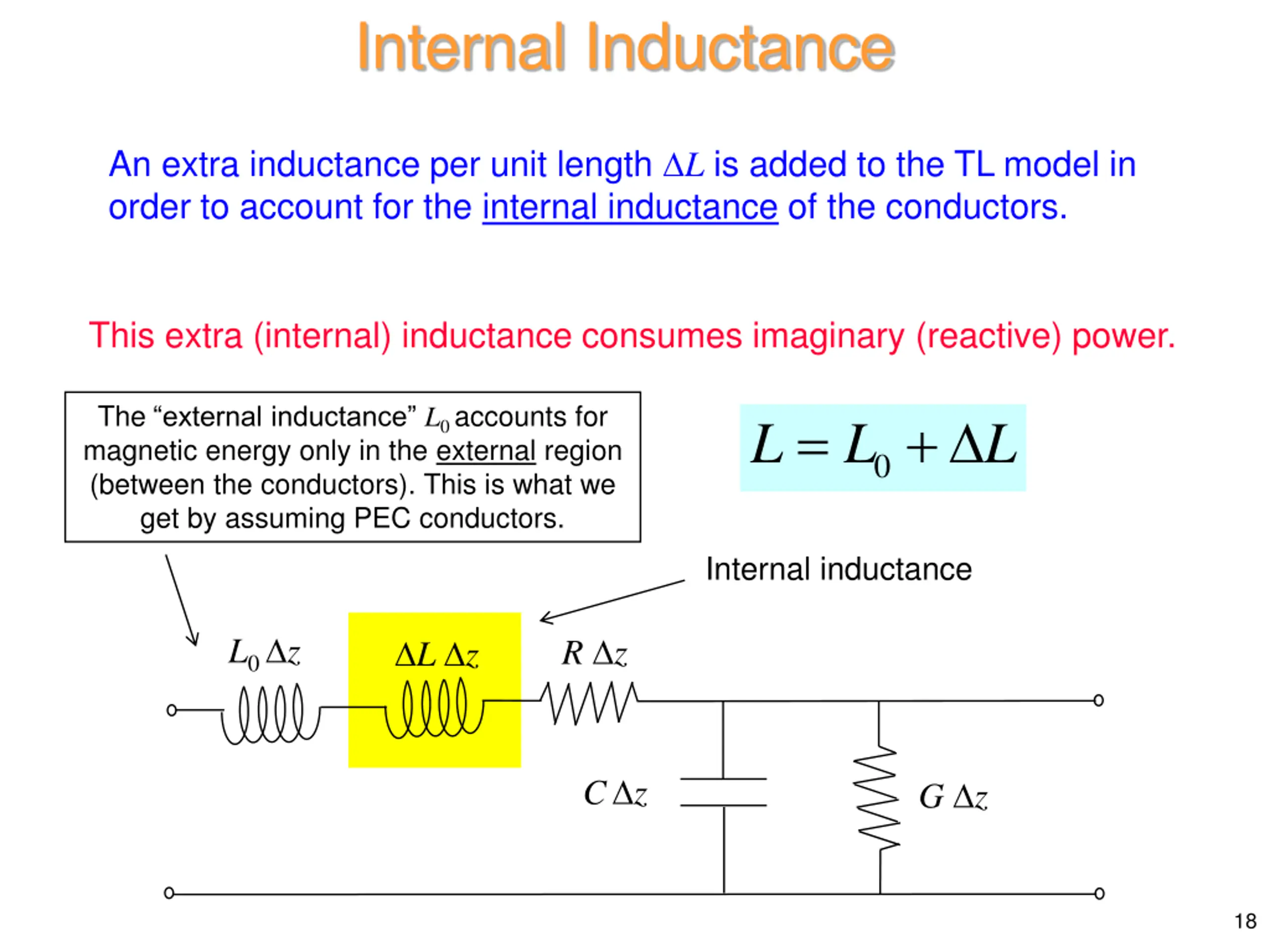 Internal Inductance An extra inductance per unit length L is added to the TL model in order to account for the internal inductance of the conductors. This extra (internal) inductance consumes imaginary (reactive) power. The external inductance L0 accounts for magnetic energy only in the external region (between the conductors). This is what we get by assuming PEC conductors. = + L L L 0 Internal inductance L0 z R z L z C z G z 18