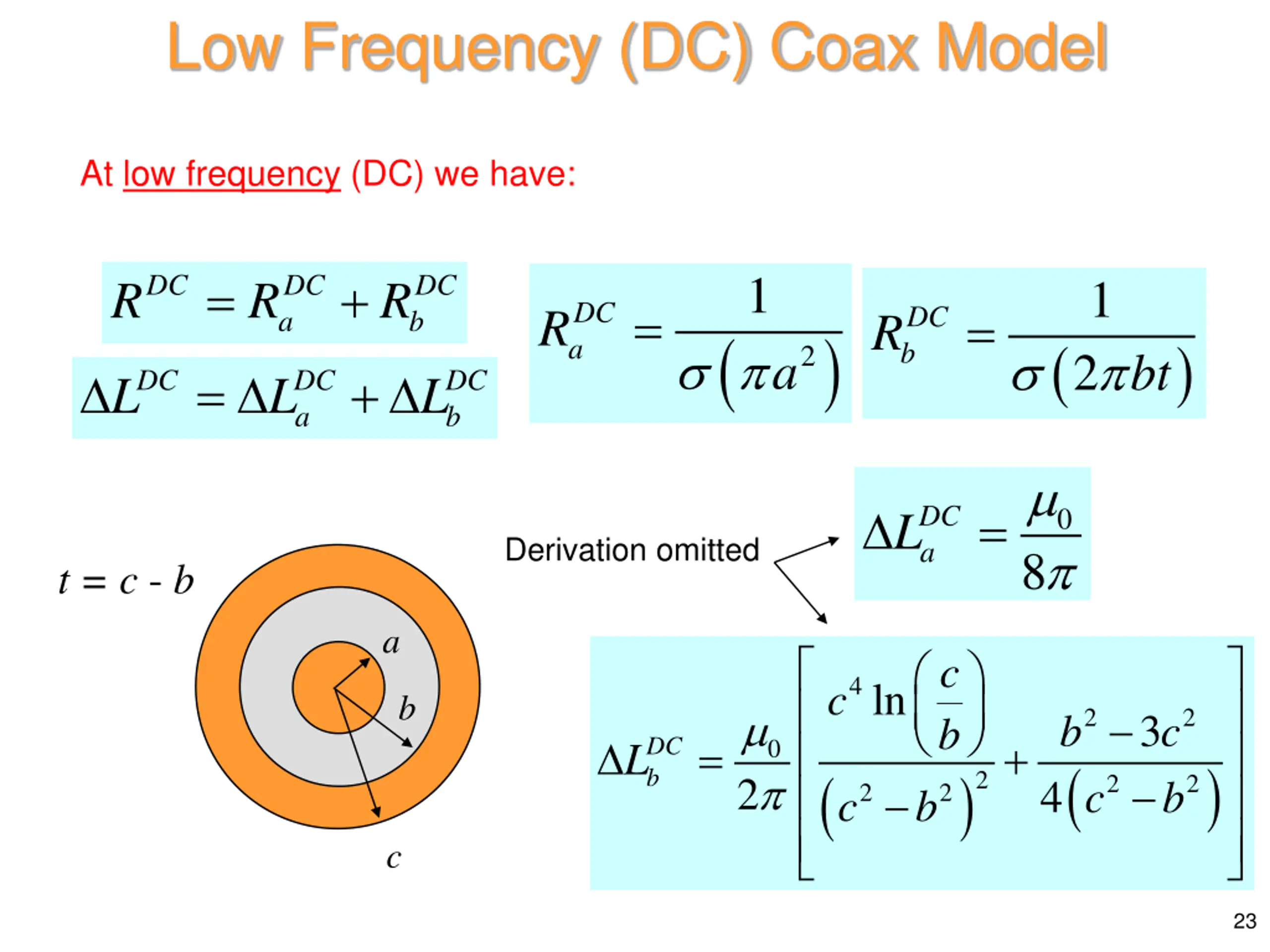Low Frequency (DC) Coax Model At low frequency (DC) we have: 1 = + DC DC a DC b 1 R R R = DC a = R DC b R ( ) ( ) 2 a 2 bt = + DC DC a DC b L L L a L = DC 0 Derivation omitted 8 t = c - b a c b 4 ln c b 2 2 3 b c b = + DC b 0 L ( ) ( ) 2 2 2 2 4 c 2 2 c b c 23