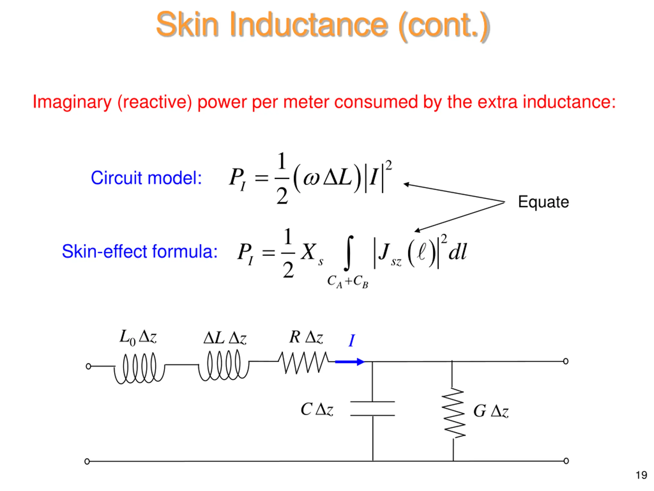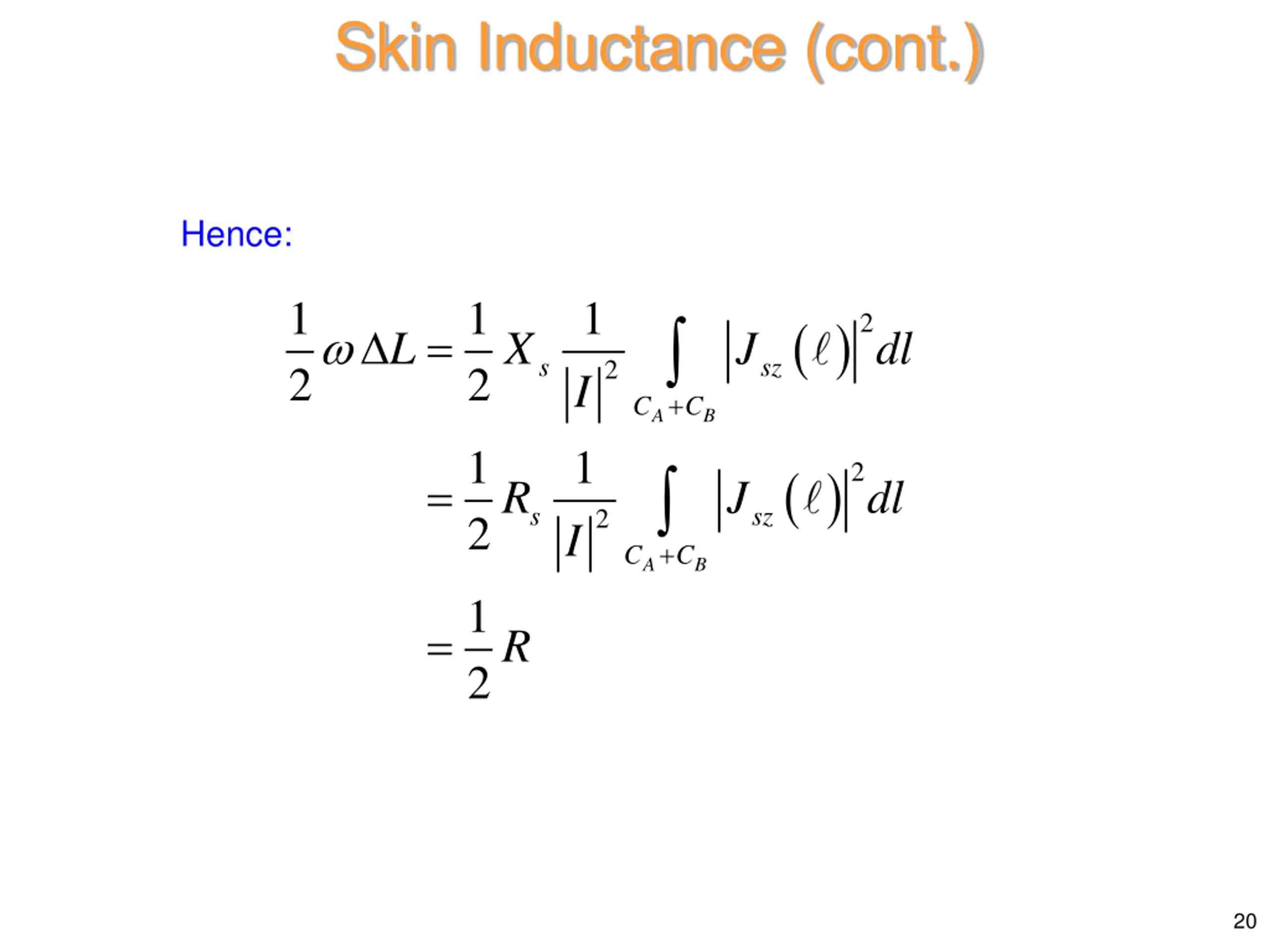 Skin Inductance (cont.) Imaginary (reactive) power per meter consumed by the extra inductance: 1 2 ( ) 2 = L I IP Circuit model: Equate 1 2 ( ) 2 = P X J dl Skin-effect formula: I s sz + C C A B L0 z R z L z I C z G z 19