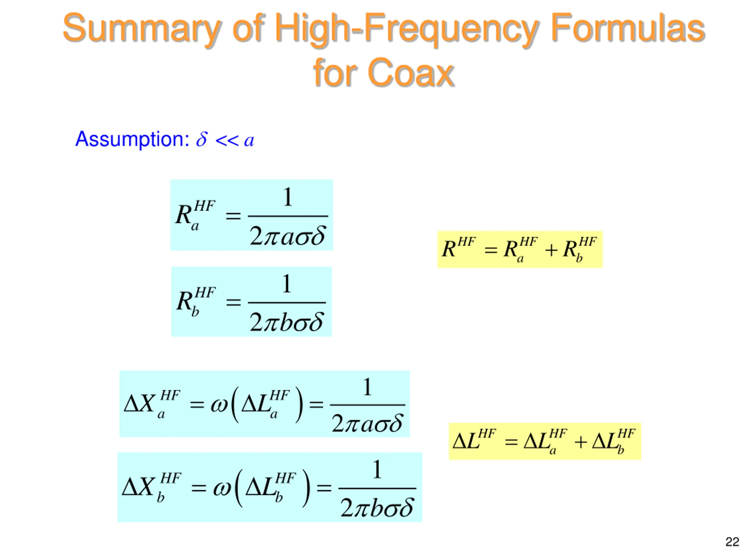 Summary of High-Frequency Formulas for Coax Assumption: << a 1 a = HF a R 2 = + HF HF a HF b R R R 1 b = HF b R 2 1 a ( ) = = HF a HF a X L 2 = + HF HF a HF b L L L 1 b ( ) = = HF b HF b X L 2 22