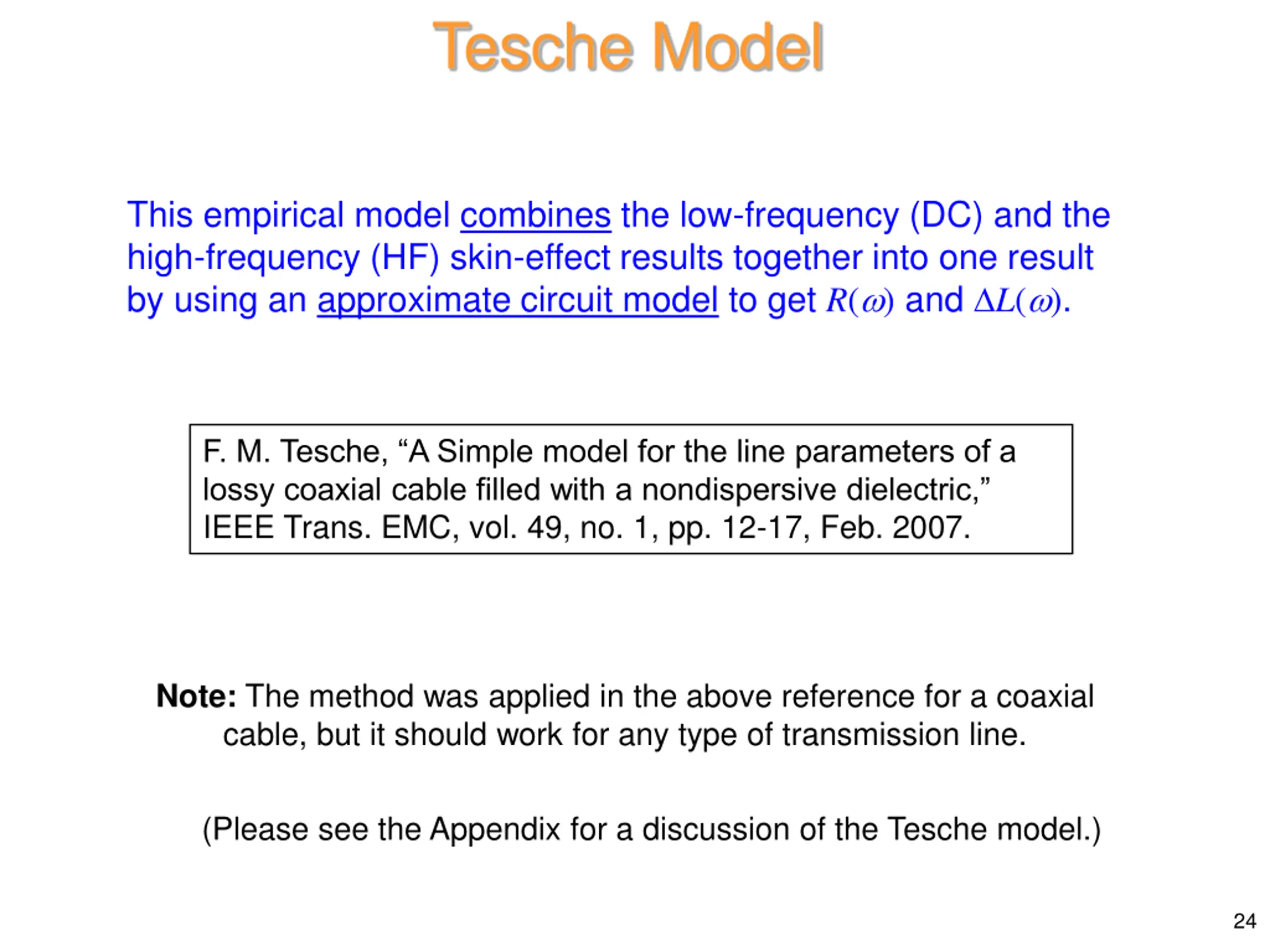Tesche Model This empirical model combines the low-frequency (DC) and the high-frequency (HF) skin-effect results together into one result by using an approximate circuit model to get R( ) and L( ). F. M. Tesche, A Simple model for the line parameters of a lossy coaxial cable filled with a nondispersive dielectric, IEEE Trans. EMC, vol. 49, no. 1, pp. 12-17, Feb. 2007. Note: The method was applied in the above reference for a coaxial cable, but it should work for any type of transmission line. (Please see the Appendix for a discussion of the Tesche model.) 24