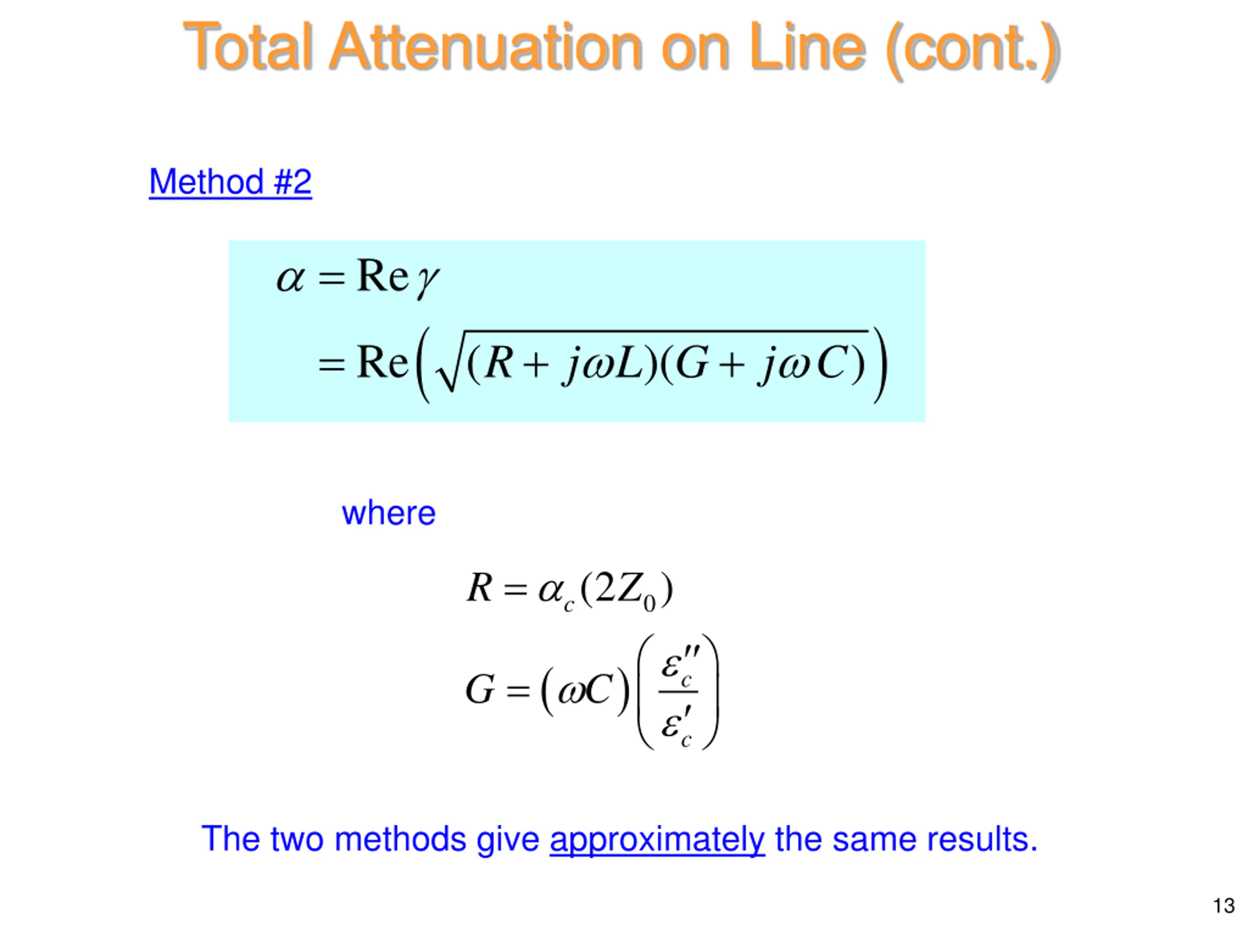 Total Attenuation on Line Method #1 = + c d = When we ignore conductor loss to calculate d, we have a TEM mode. d TEM = = = TEM z k j k k jk d = k so d = + k Hence, c 12