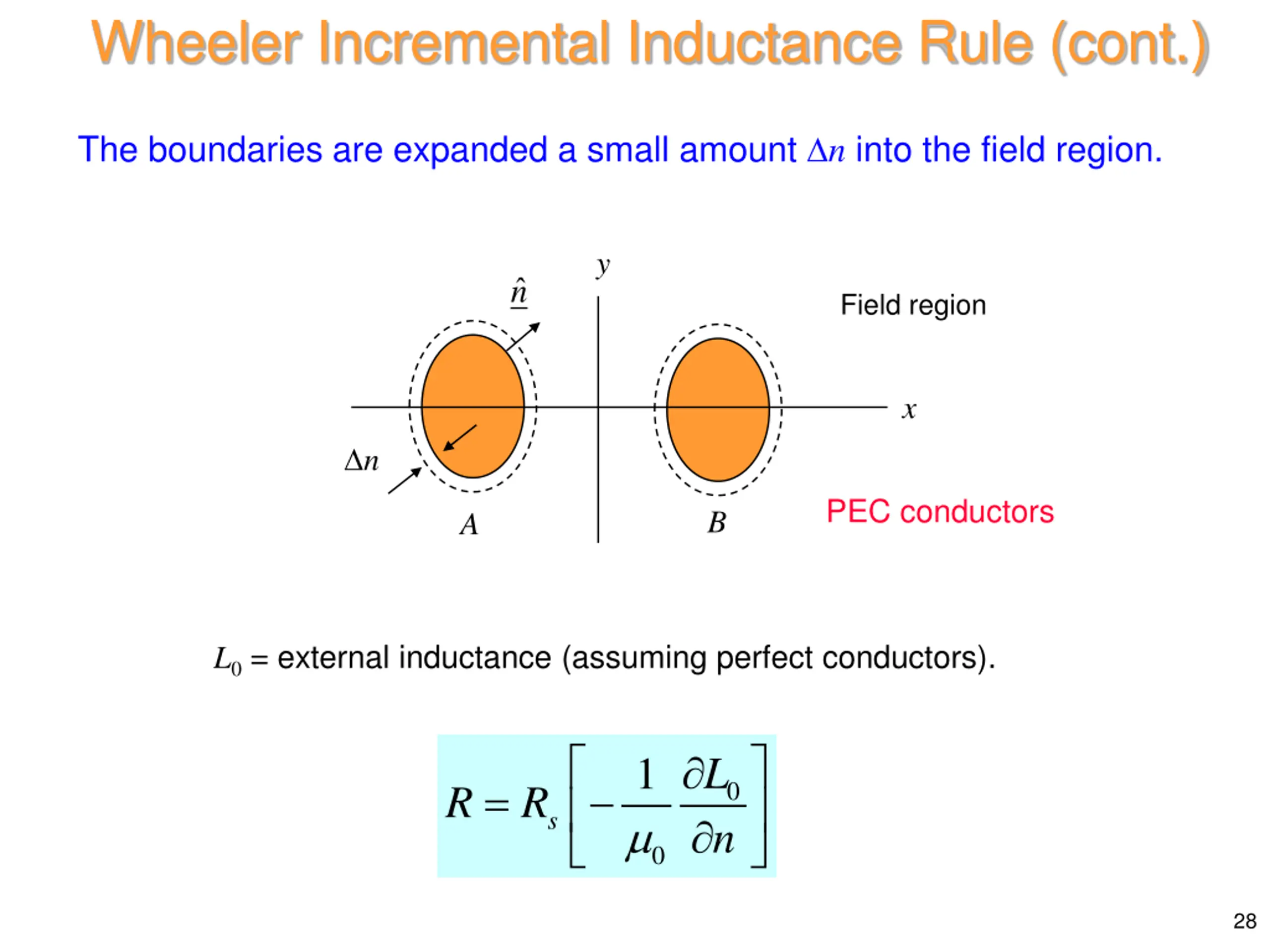 Wheeler Incremental Inductance Rule y n 1 I 2 = ( ) l R R J dl x s sz 2 C B A Wheeler showed that R could be expressed in a way that is easy to calculate (provided we have a formula for L0): 1 L n = 0 R R s 0 L0 is the external inductance (calculated assuming PEC conductors) and n is an increase in the dimension of the conductors (expanded into the active field region). H. Wheeler, "Formulas for the skin-effect," Proc. IRE, vol. 30, pp. 412-424, 1942. 27