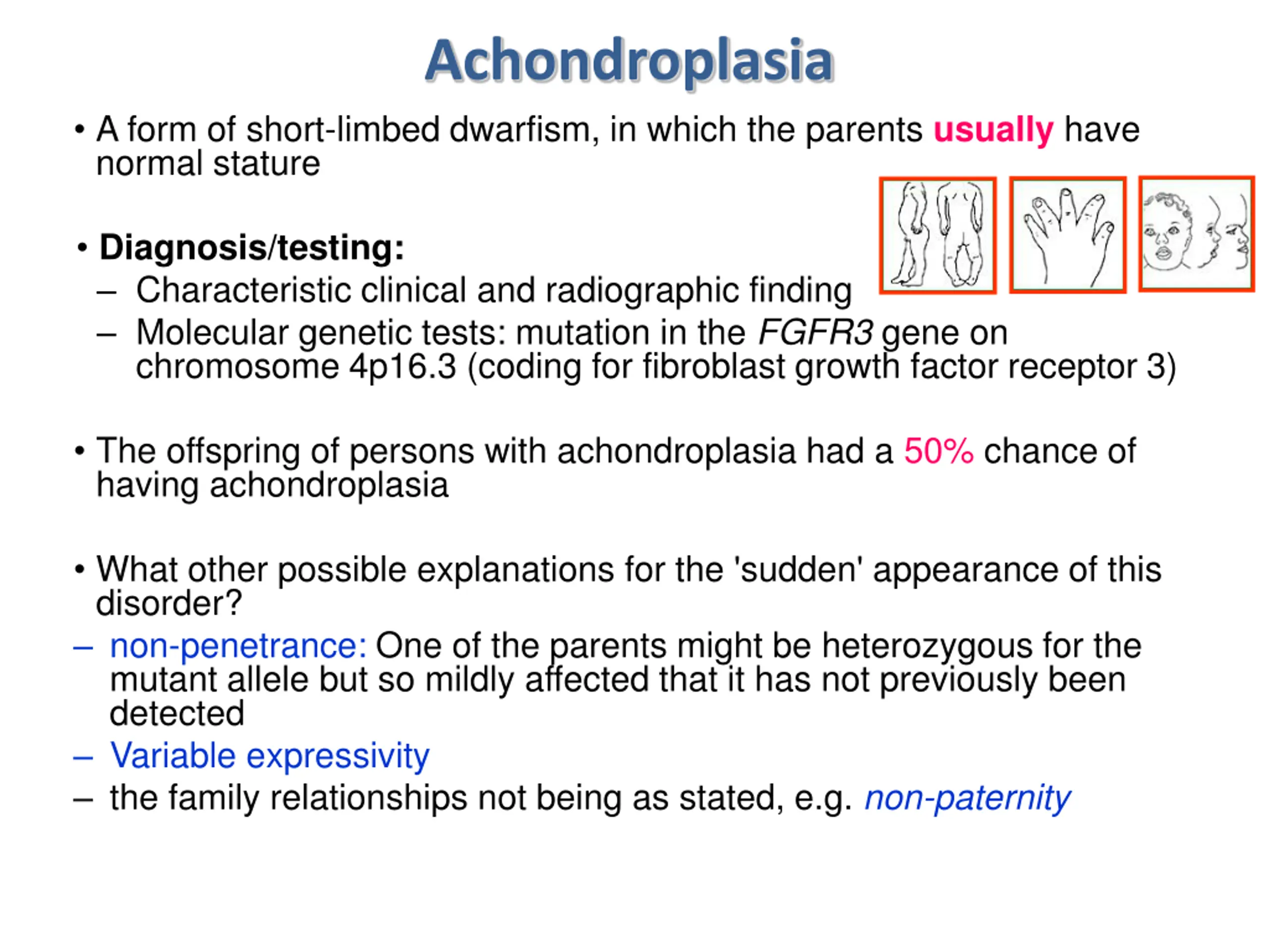 Achondroplasia A form of short-limbed dwarfism, in which the parents usually have normal stature Diagnosis/testing: Characteristic clinical and radiographic finding Molecular genetic tests: mutation in the FGFR3 gene on chromosome 4p16.3 (coding for fibroblast growth factor receptor 3) The offspring of persons with achondroplasia had a 50% chance of having achondroplasia What other possible explanations for the 'sudden' appearance of this disorder? non-penetrance: One of the parents might be heterozygous for the mutant allele but so mildly affected that it has not previously been detected Variable expressivity the family relationships not being as stated, e.g. non-paternity