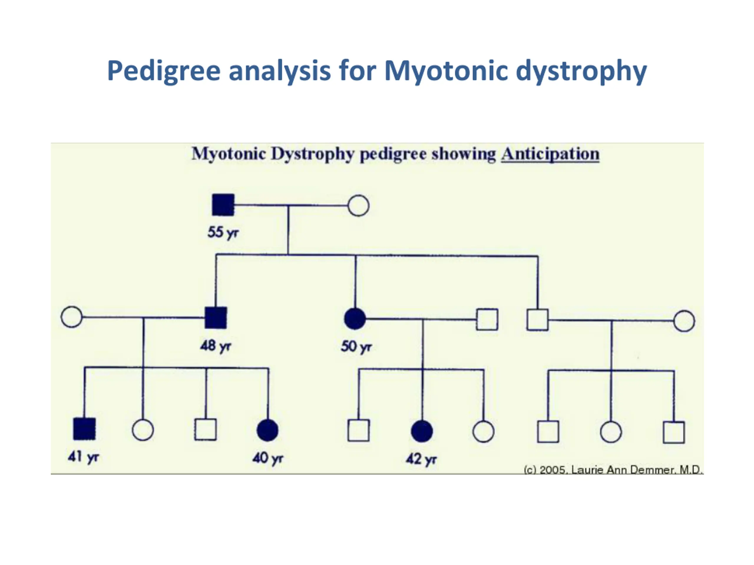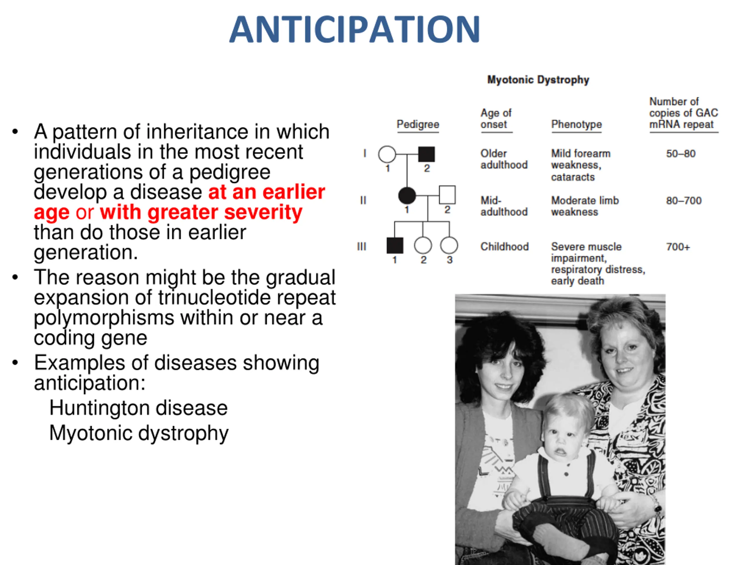 ANTICIPATION A pattern of inheritance in which individuals in the most recent generations of a pedigree develop a disease at an earlier age or with greater severity than do those in earlier generation. The reason might be the gradual expansion of trinucleotide repeat polymorphisms within or near a coding gene Examples of diseases showing anticipation: Huntington disease Myotonic dystrophy