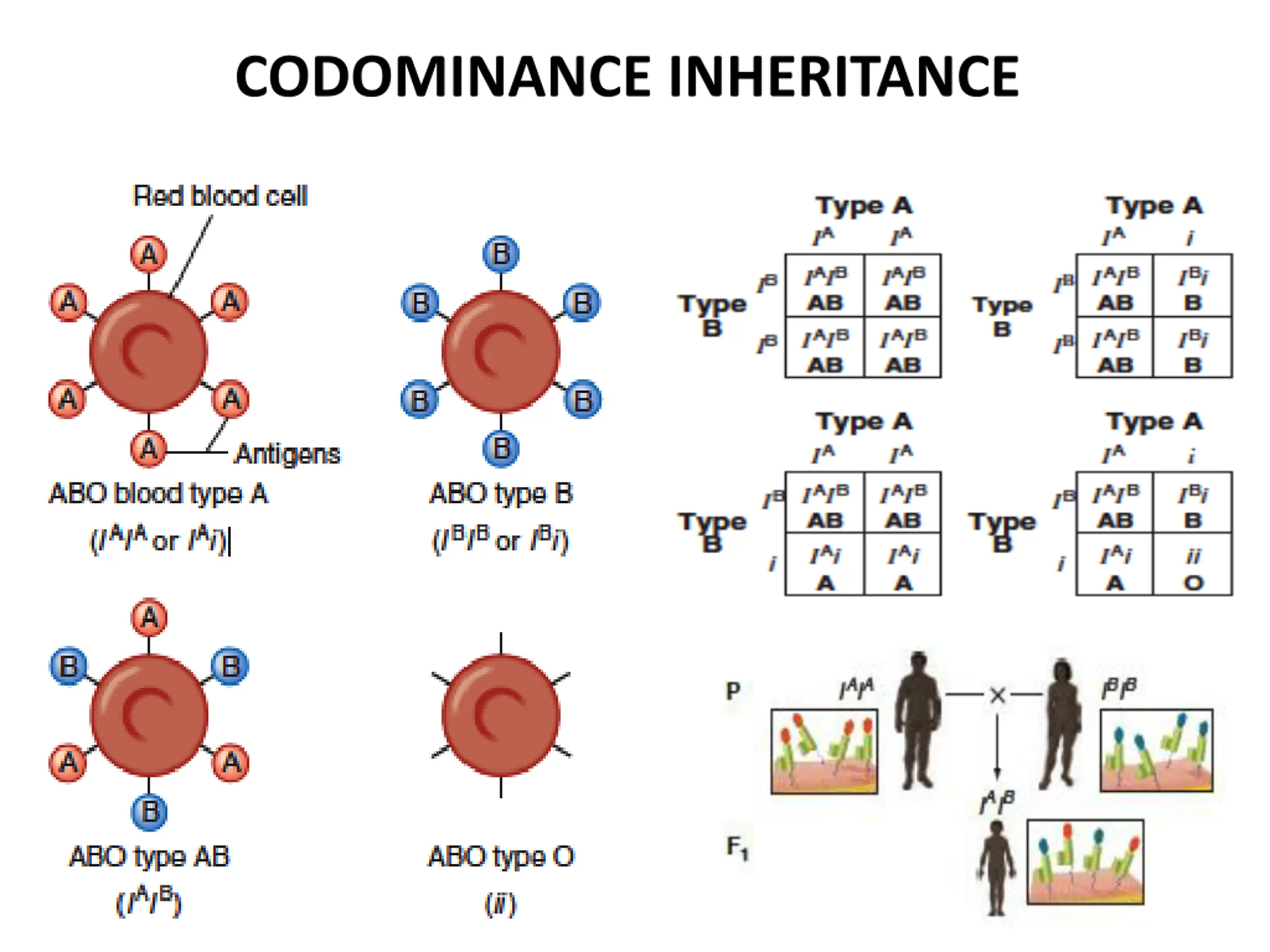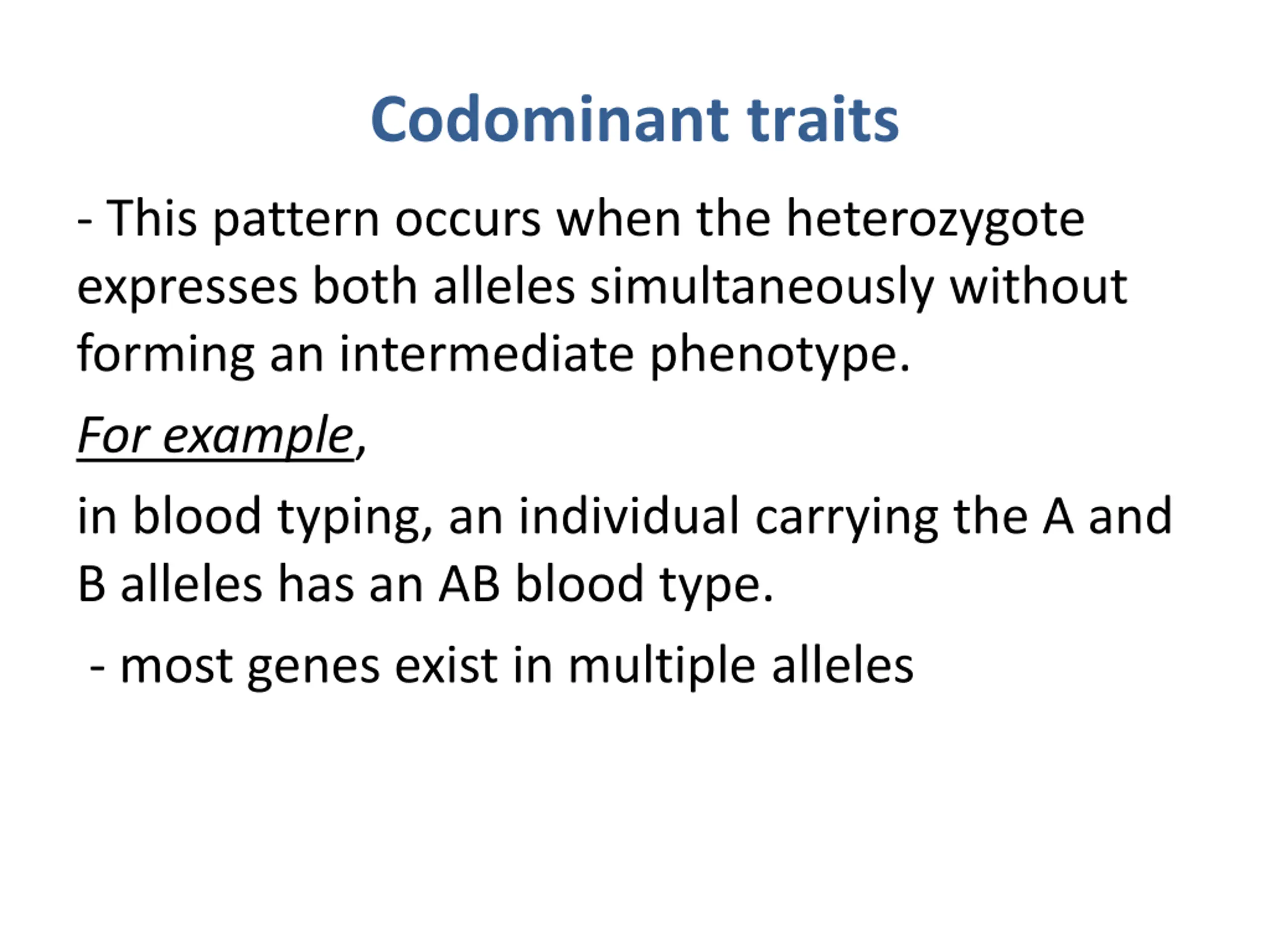 Codominant traits - This pattern occurs when the heterozygote expresses both alleles simultaneously without forming an intermediate phenotype. For example, in blood typing, an individual carrying the A and B alleles has an AB blood type. - most genes exist in multiple alleles
