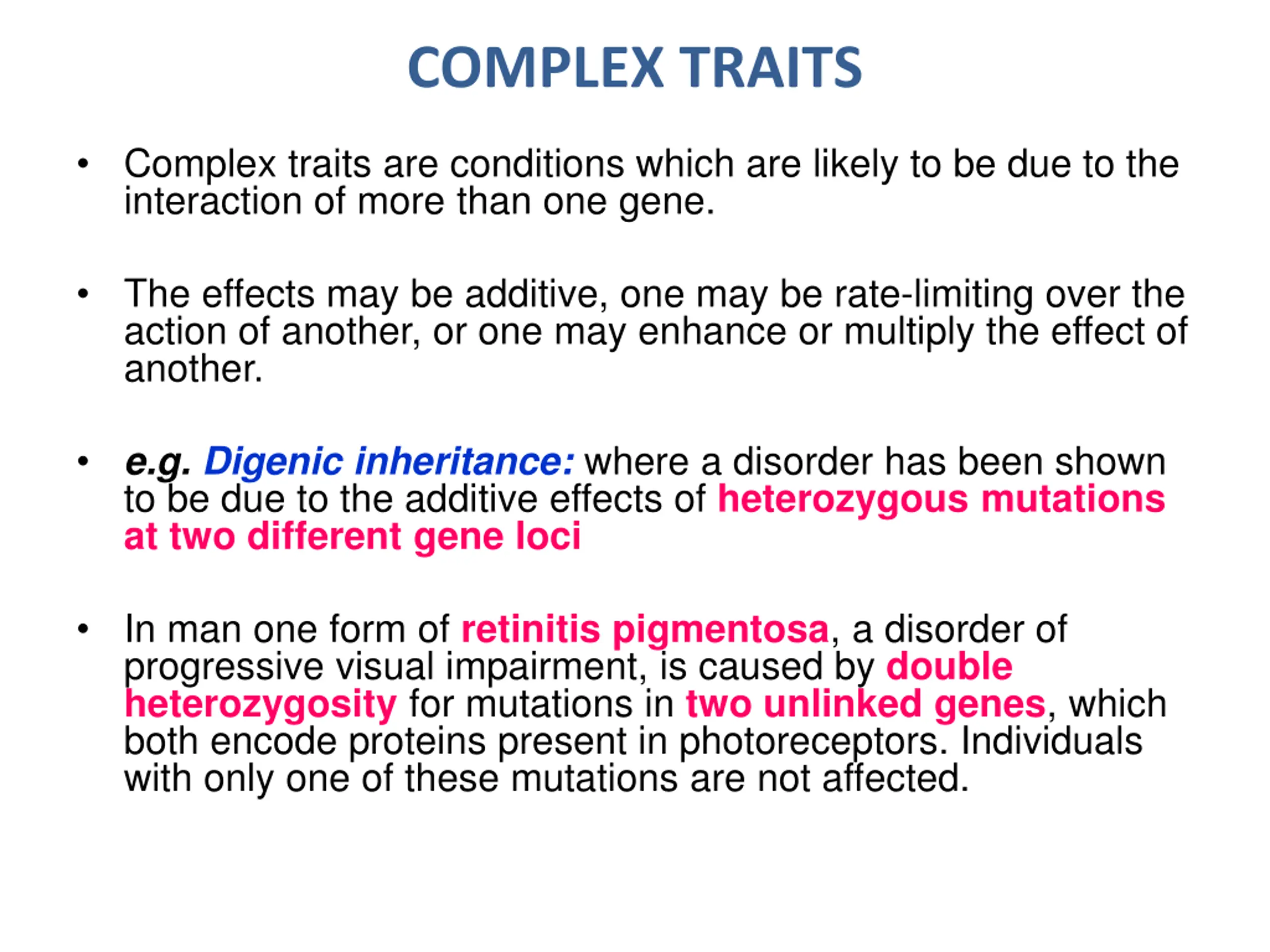 COMPLEX TRAITS Complex traits are conditions which are likely to be due to the interaction of more than one gene. The effects may be additive, one may be rate-limiting over the action of another, or one may enhance or multiply the effect of another. e.g. Digenic inheritance: where a disorder has been shown to be due to the additive effects of heterozygous mutations at two different gene loci In man one form of retinitis pigmentosa, a disorder of progressive visual impairment, is caused by double heterozygosity for mutations in two unlinked genes, which both encode proteins present in photoreceptors. Individuals with only one of these mutations are not affected.
